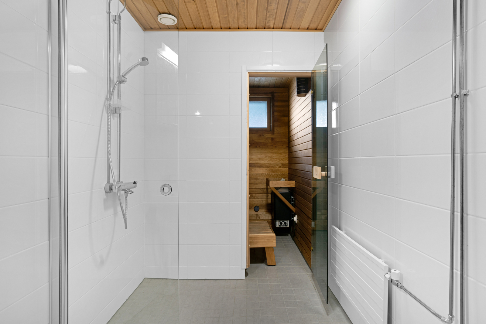 WC-istuin, peili, suihku ja kiinteät valaisimet, seinät (kaakeli), lattiat (laatta) |