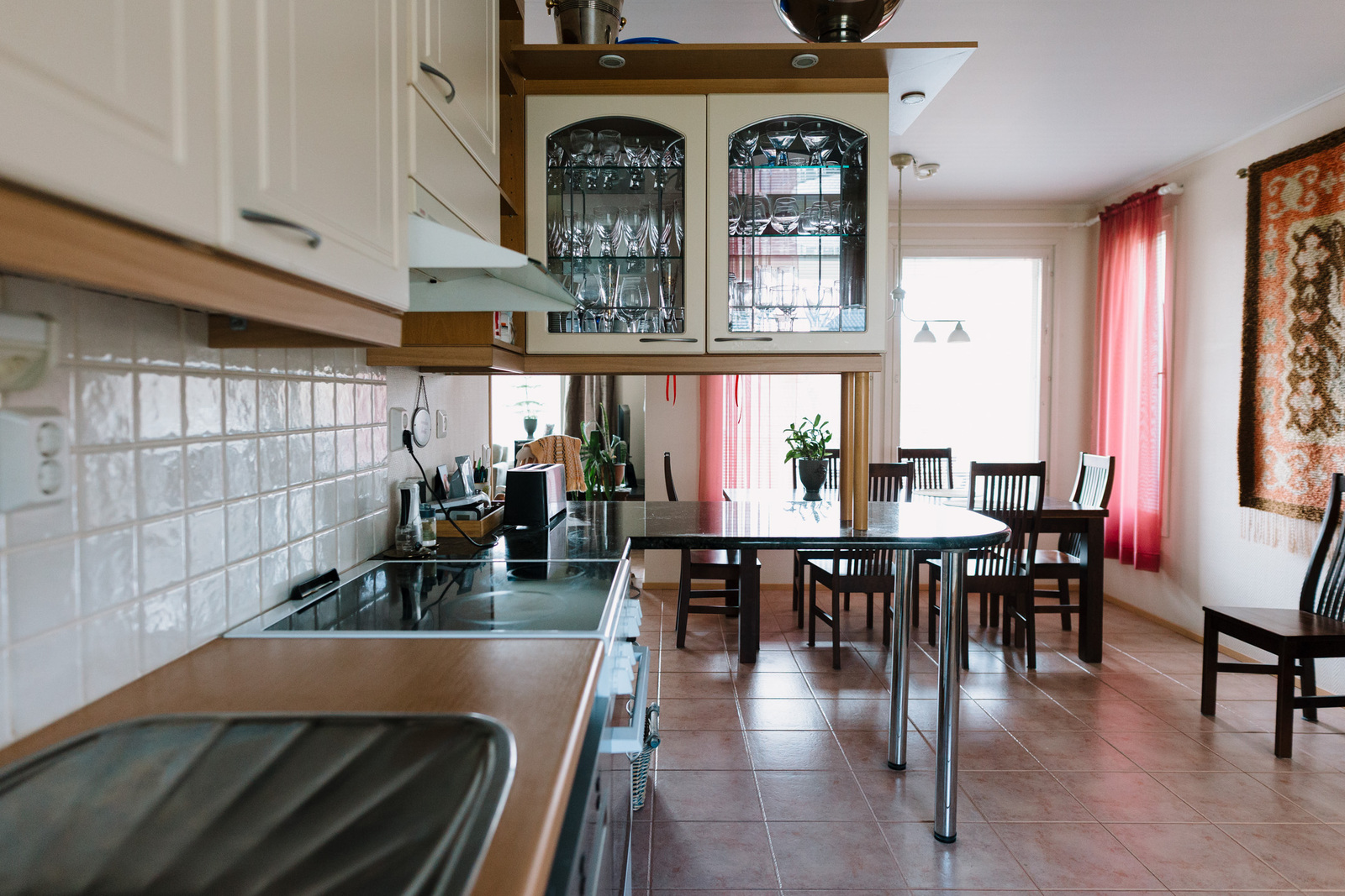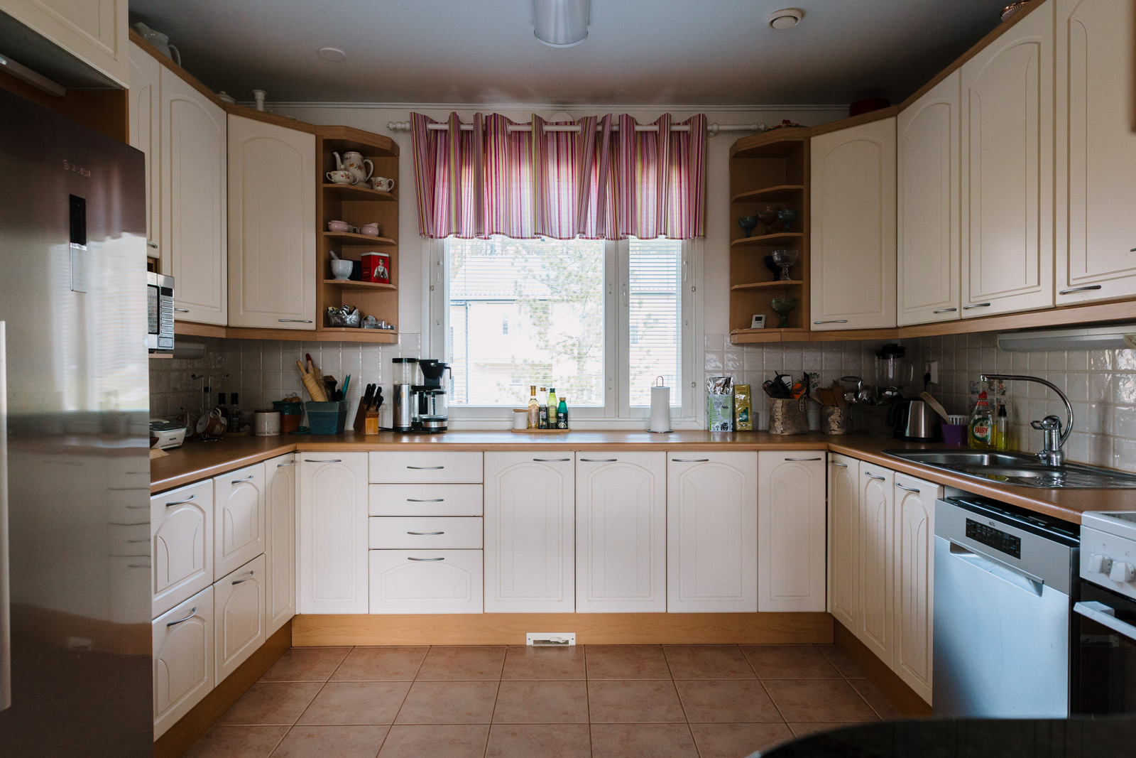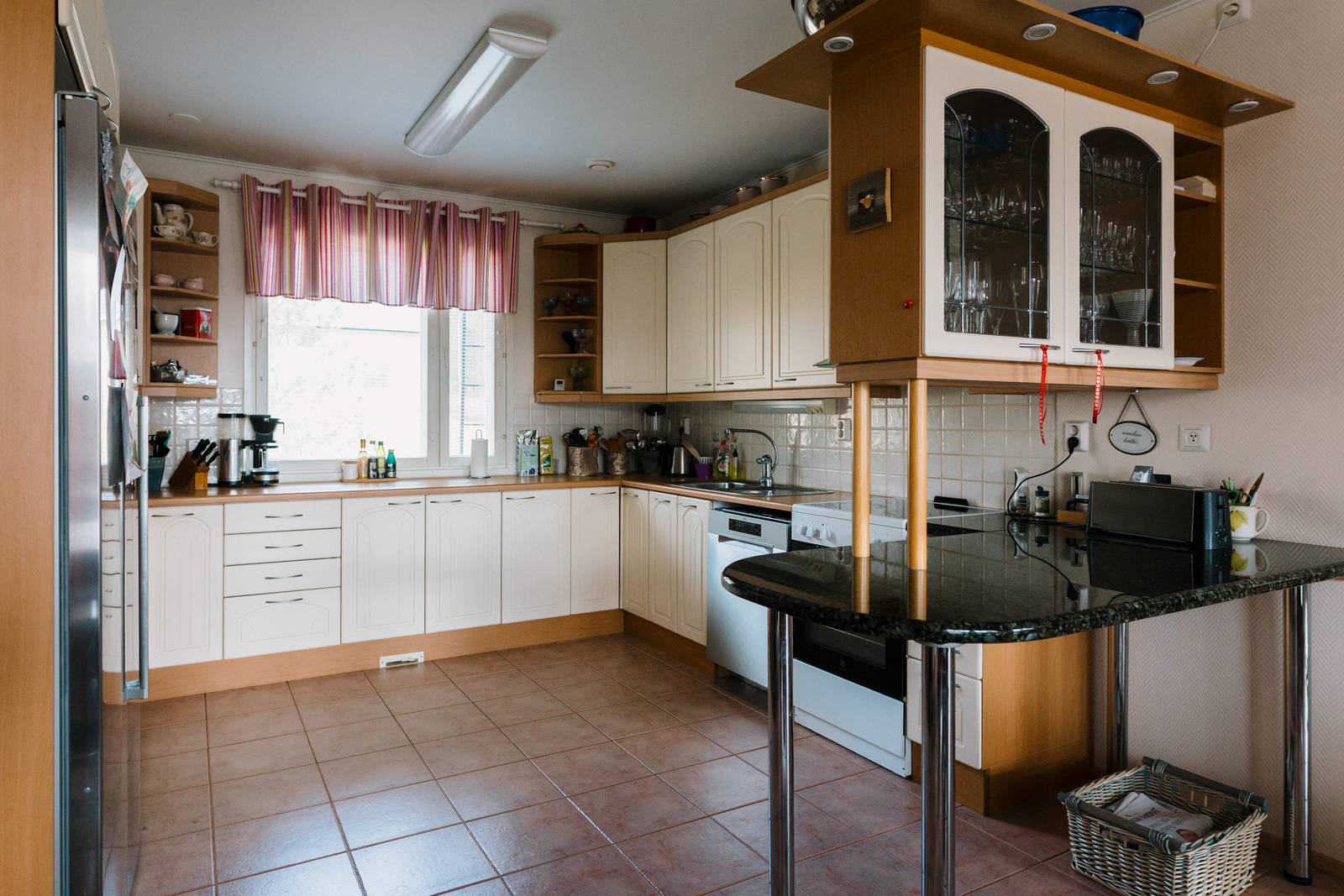 | Keittiön kuvaus | Liesi (Keraaminen liesi), työtasot (laminaatti ja kivi), seinät (lasikuitutapetti), lattiat (laatta), jääkaappi, erillinen pakastin, astianpesukone ja kiinteät valaisimet, liesituuletin / hormi |