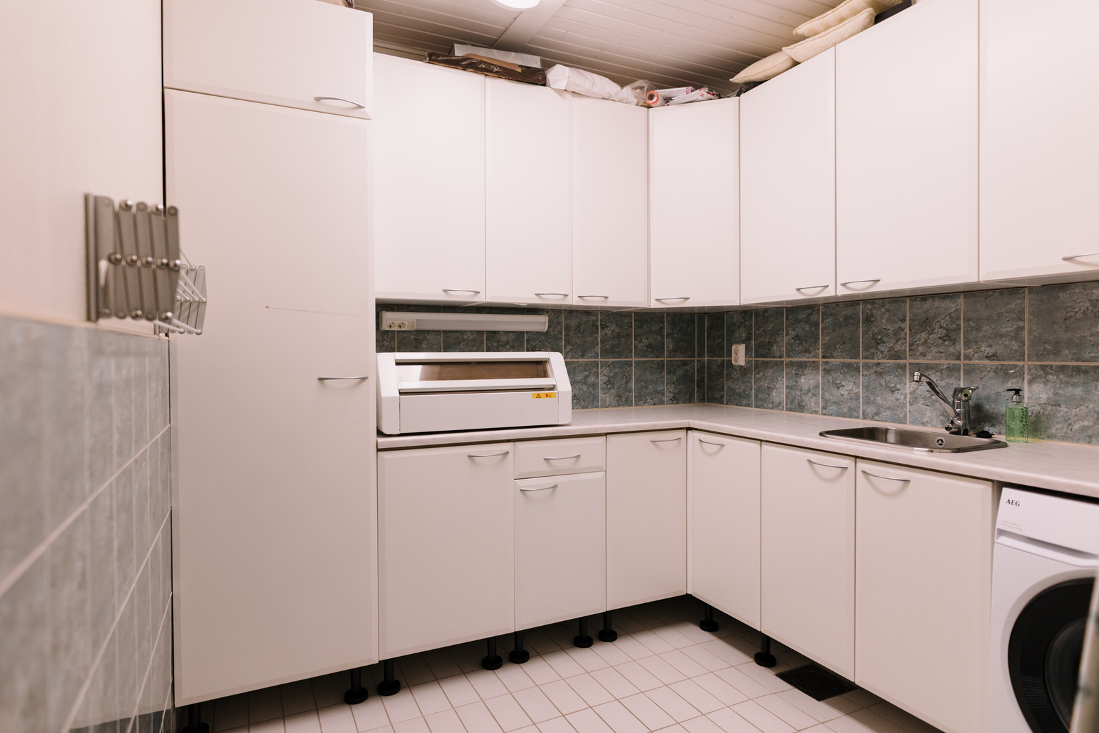 | Kodinhoitohuoneen kuvaus | Lattialämmitys, pesuallas, pöytätaso ja pesukoneliitäntä, lattiat (laatta), seinät (osalaatoitus ja lasikuitutapetti) |