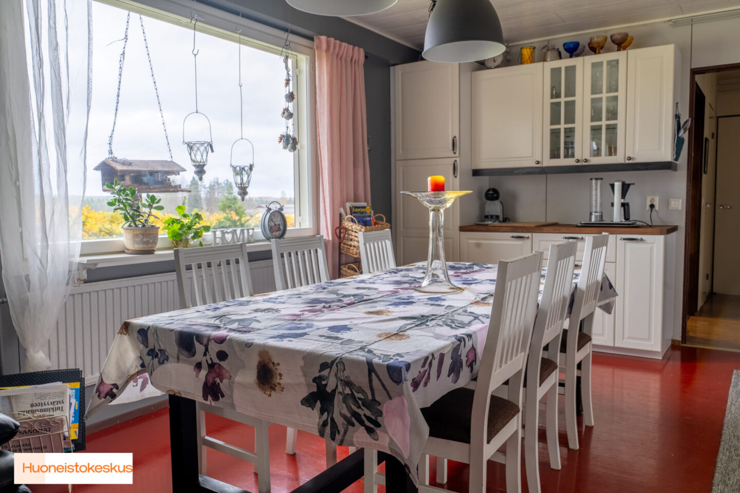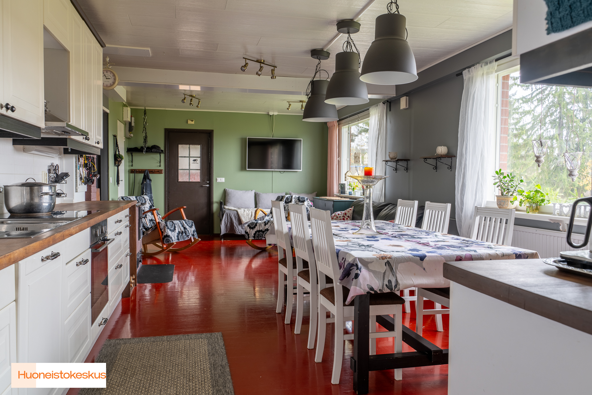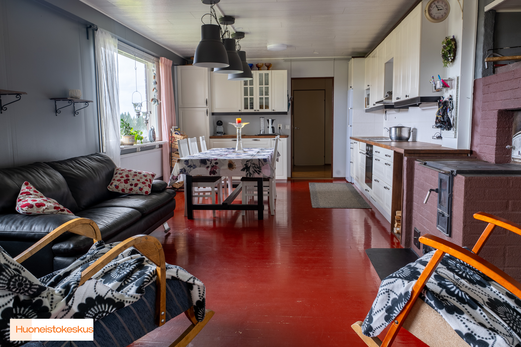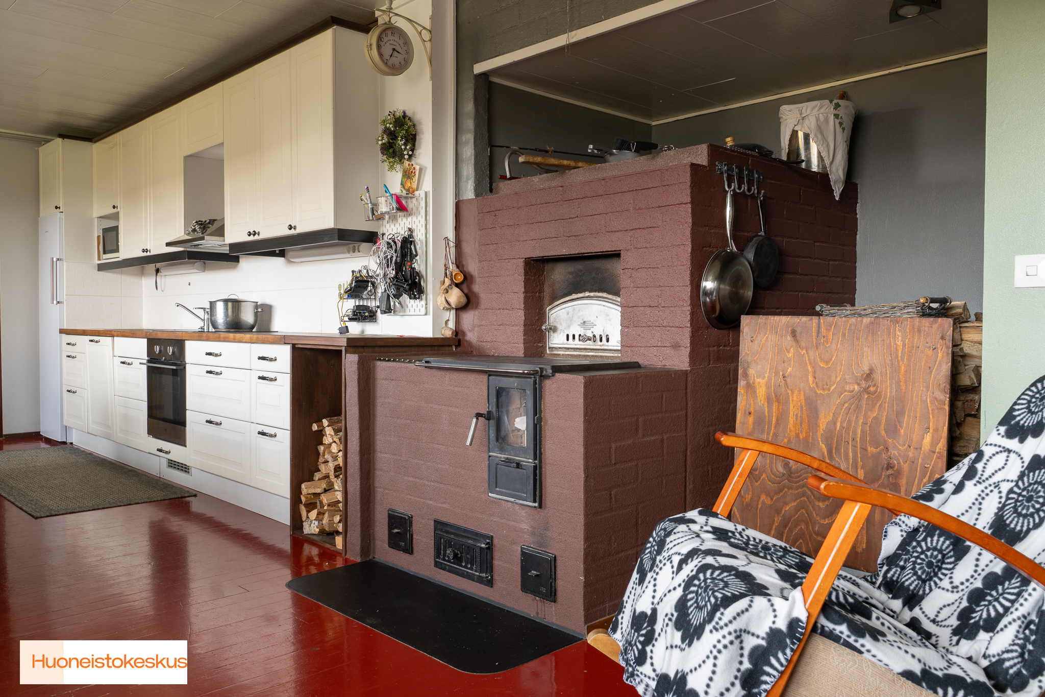 Liesi (Keraaminen liesi), seinät (maali), lattiat (lauta), jää-viileäkaappi, astianpesukone, liesituuletin ja leivinuuni/puuhella |