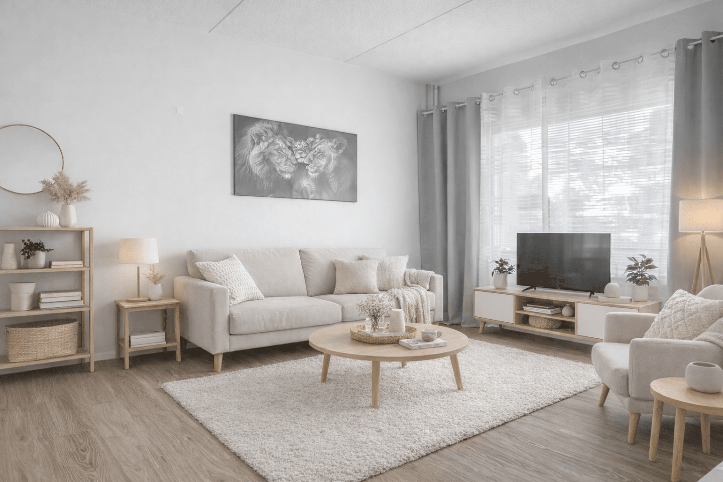 Olohuoneen kuvaus Seinät (maali), lattiat (laminaatti)