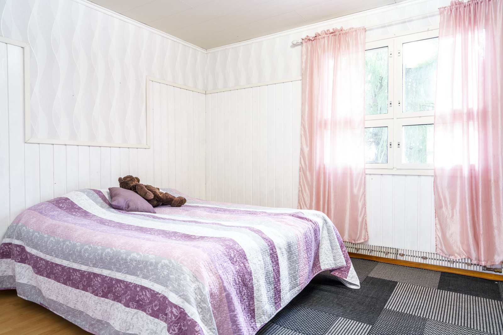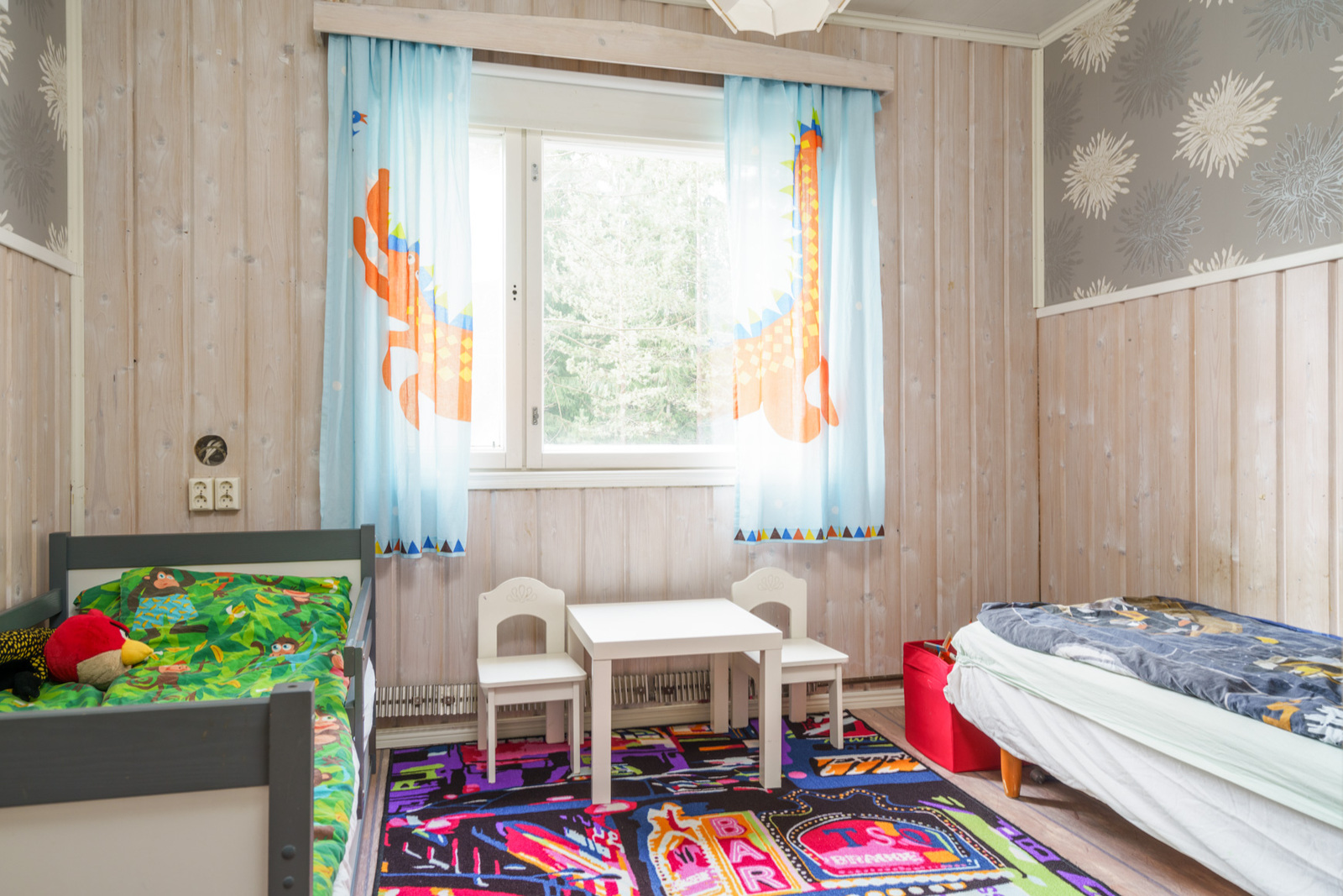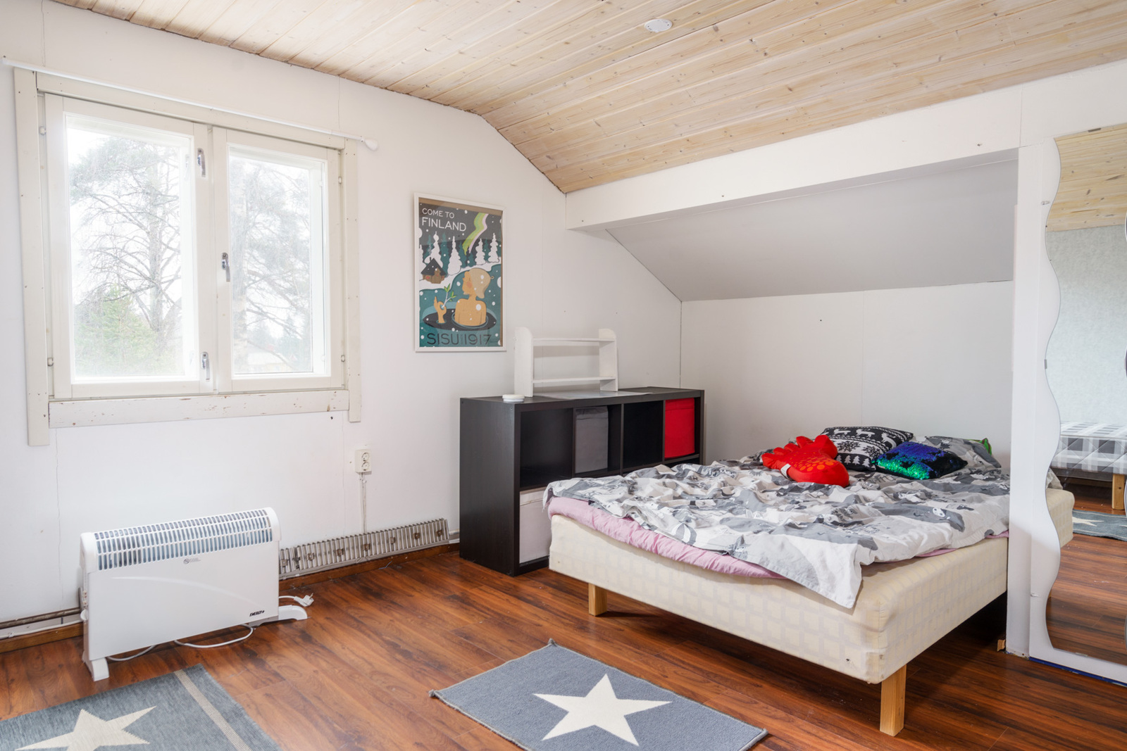 | Makuuhuoneen kuvaus | Lukumäärä: 3, seinät (puolipaneeli, maali ja puu), lattiat (laminaatti) |