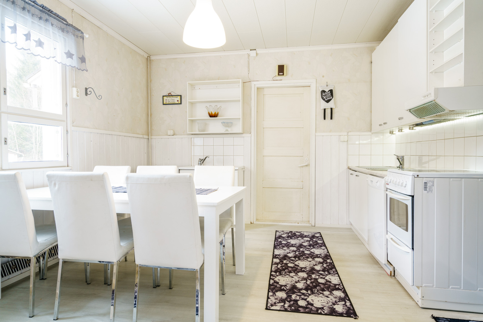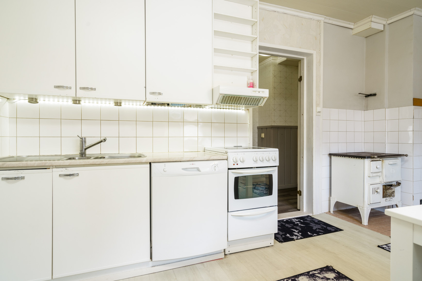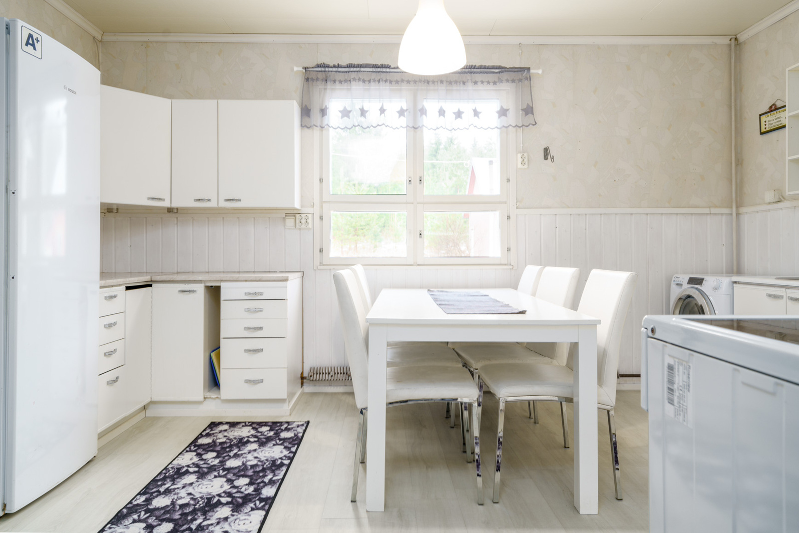 | Keittiön kuvaus | Liesi (Keraaminen liesi ja puuliesi), seinät (tapetti, puu ja osalaatoitus), lattiat (vinyyli), liesi, jääkaappi, astianpesukone ja liesituuletin / hormi |