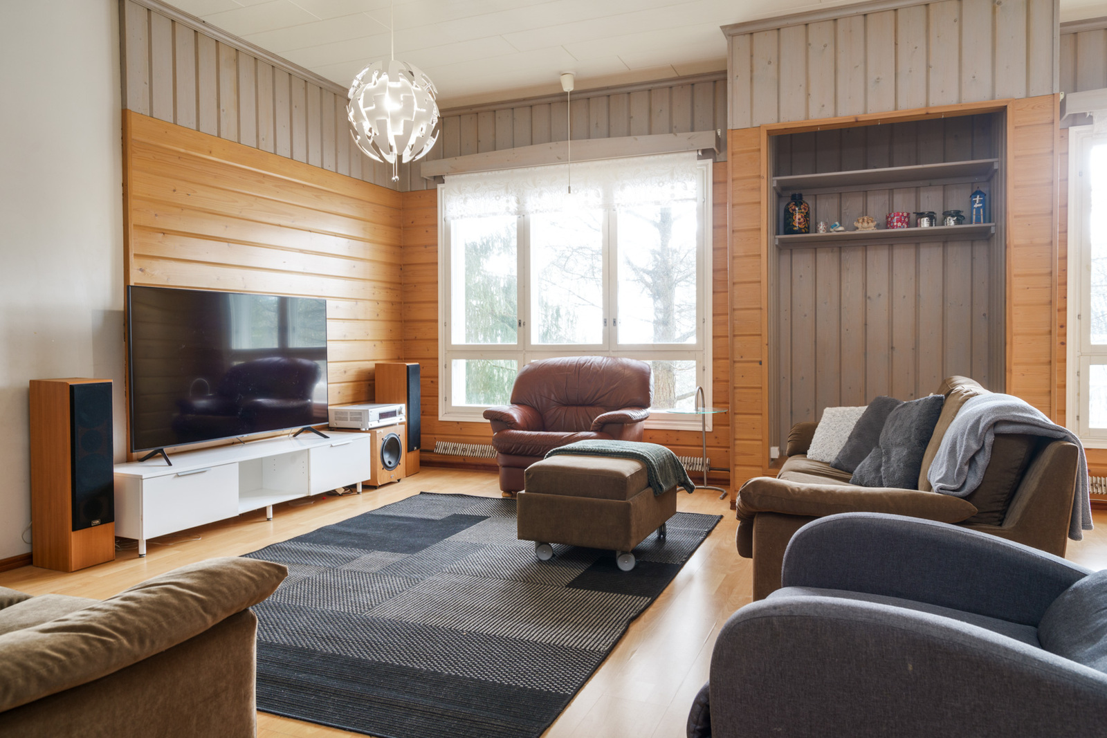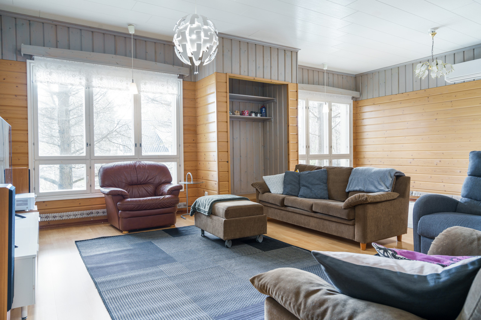 | Olohuoneen kuvaus | Seinät (puu), lattiat (laminaatti) |