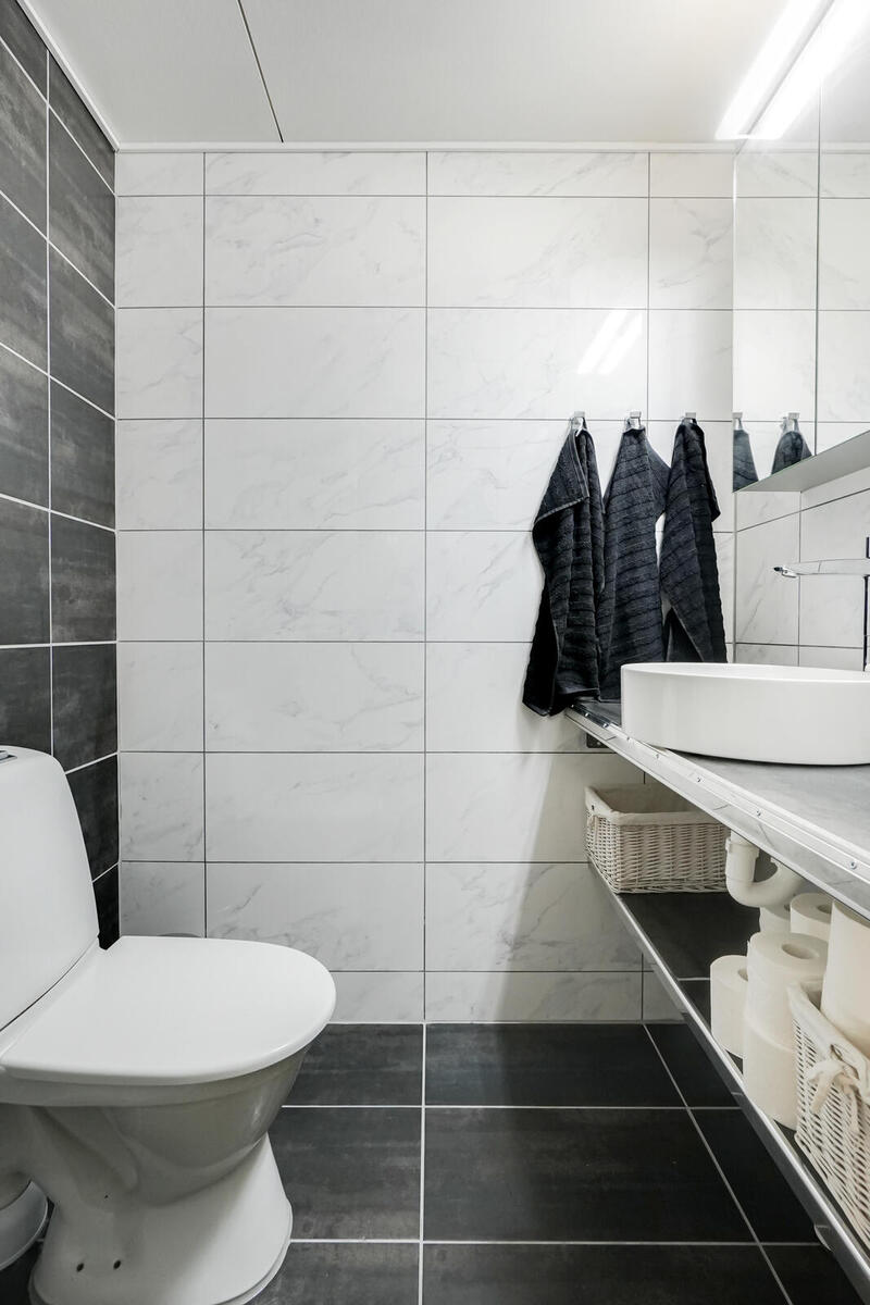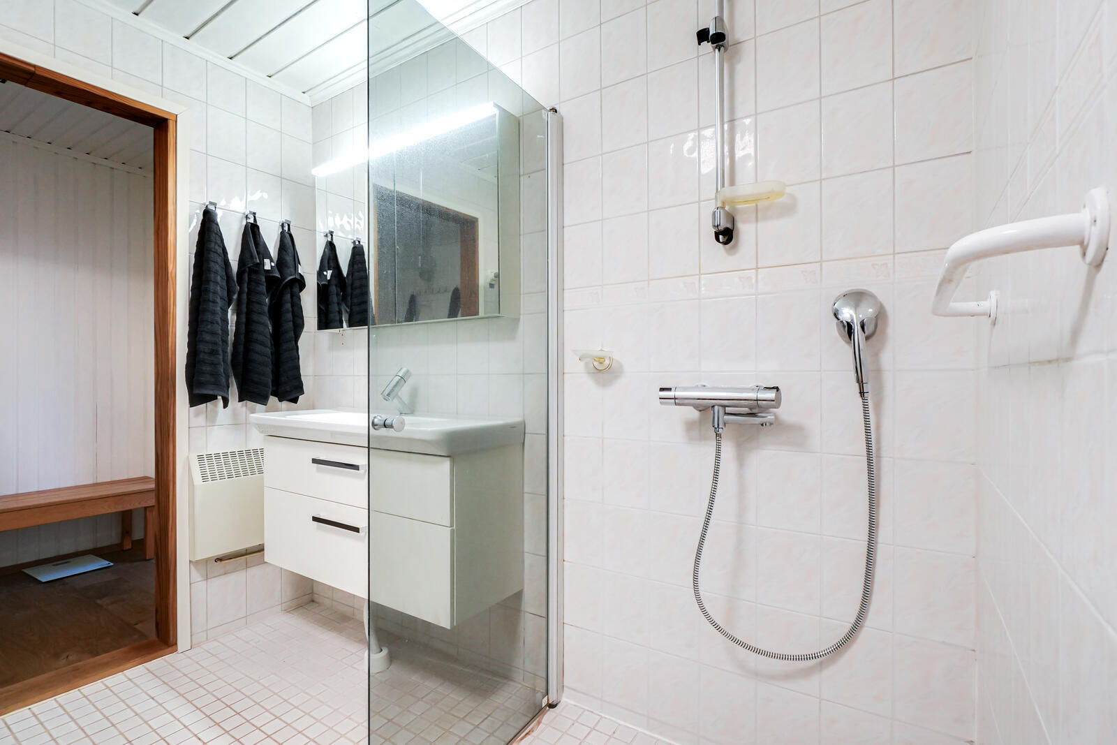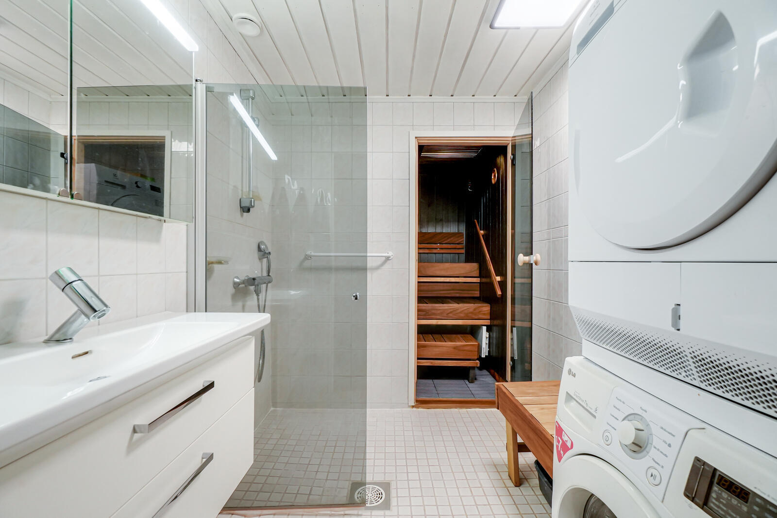 Lattialämmitys, pesukoneliitäntä ja suihku, seinät (kaakeli), lattiat (laatta) |