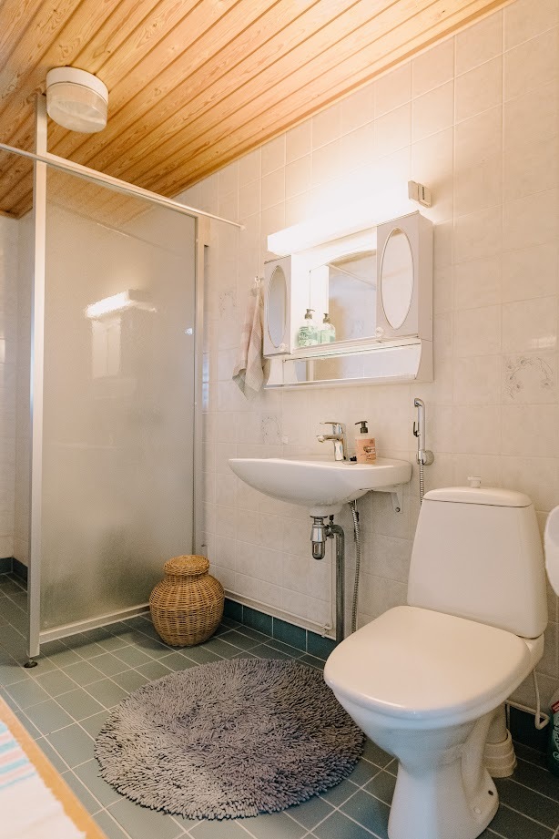 | Kylpyhuoneen kuvaus | Suihkuseinä, wc-istuin ja pesukoneliitäntä, seinät (kaakeli), lattiat (laatta) |