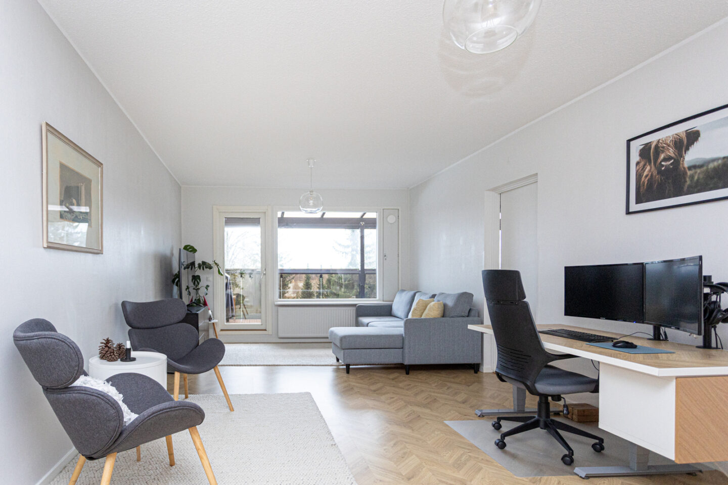 | Olohuoneen kuvaus | Seinät (tapetti), lattiat (laminaatti), Käynti parvekkeelle |