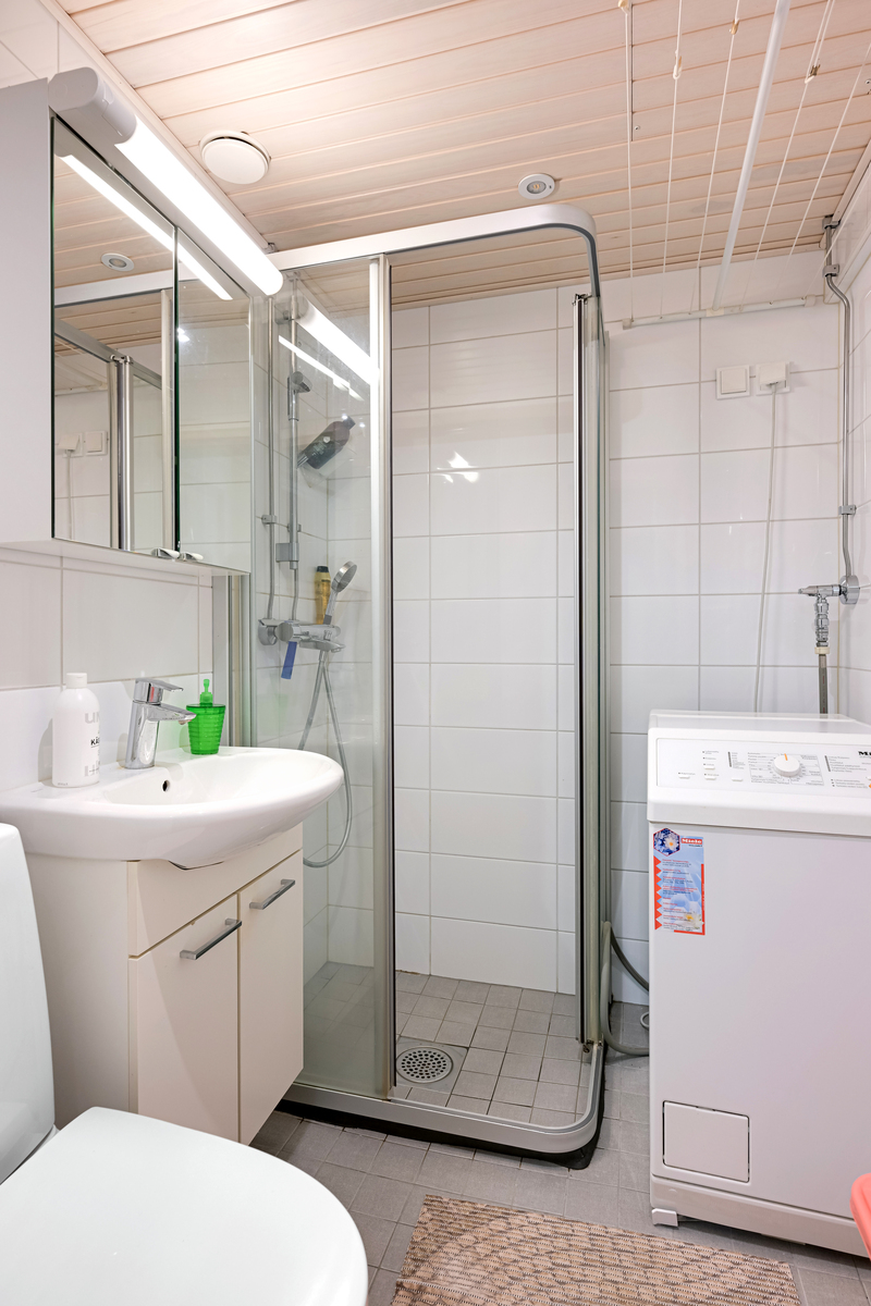 | Kylpyhuoneen kuvaus | Peilikaappi, pesukoneliitäntä, suihku, suihkuseinä ja wc-istuin, seinät (kaakeli), lattiat (laatta) |