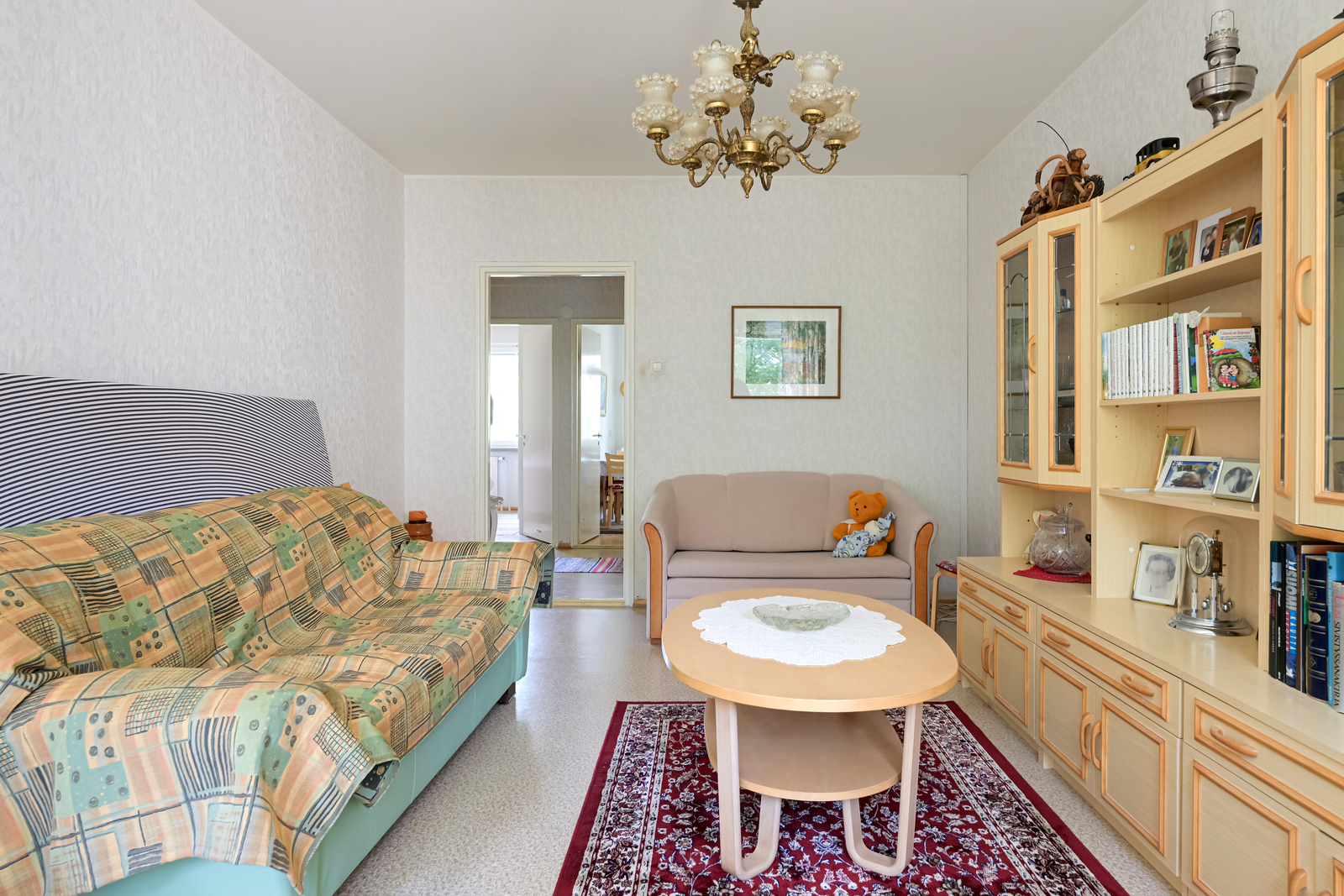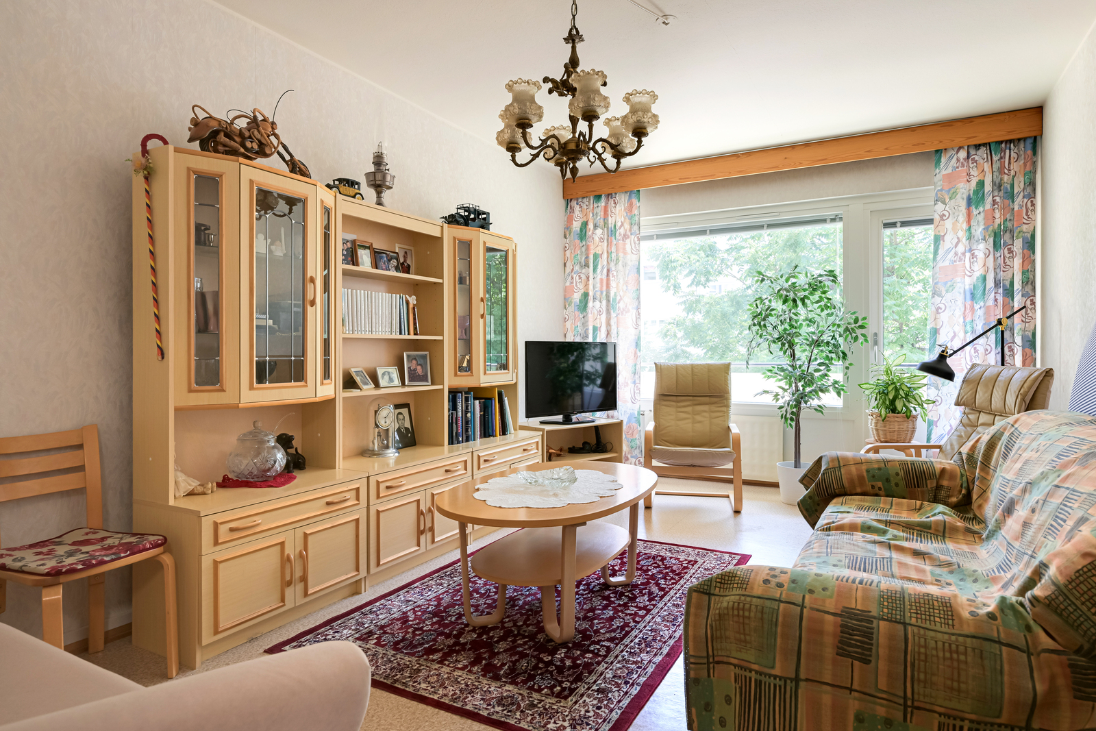 | Olohuoneen kuvaus | Seinät (tapetti), lattiat (muovimatto), Olohuone tarvitsee remontin |
