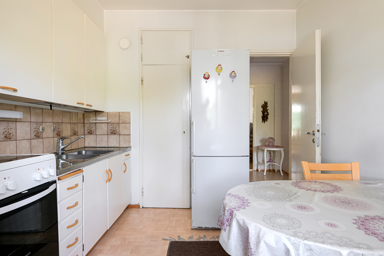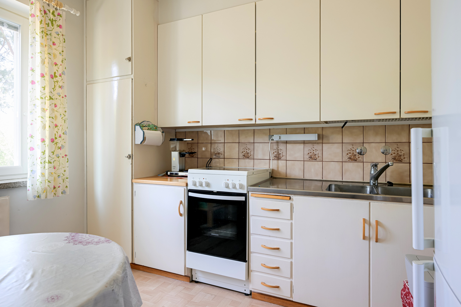 | Keittiön kuvaus | Liesi (sähköliesi), työtasot (laminaatti), seinät (maali), lattiat (muovimatto), liesi |