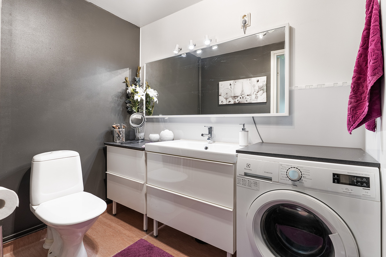 | WC-tilojen kuvaus | Lattialämmitys, pesukoneliitäntä, lattiakaivo, peili, pesuallas, bidee-suihku ja wc-istuin, seinät (Maali), lattiat (Muovimatto) |