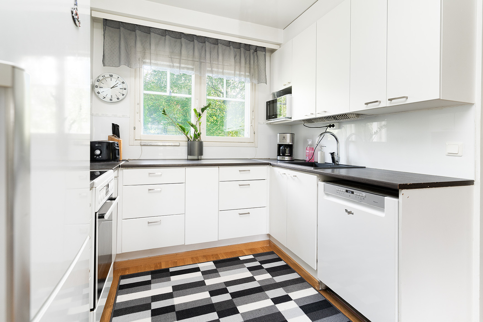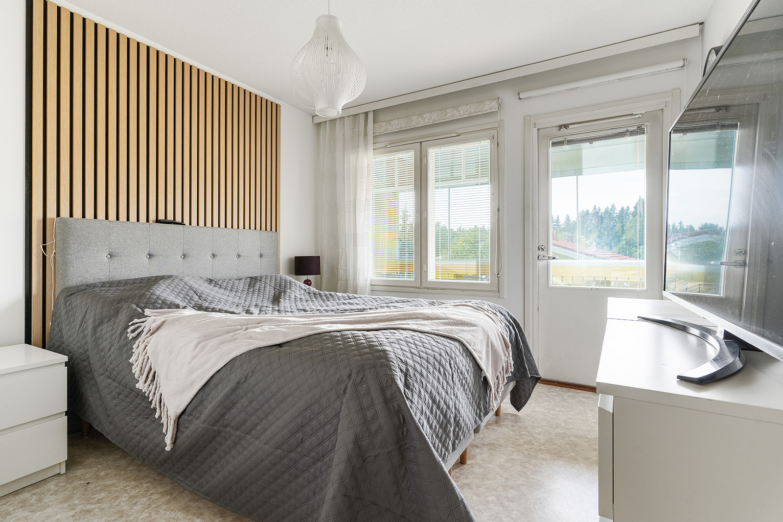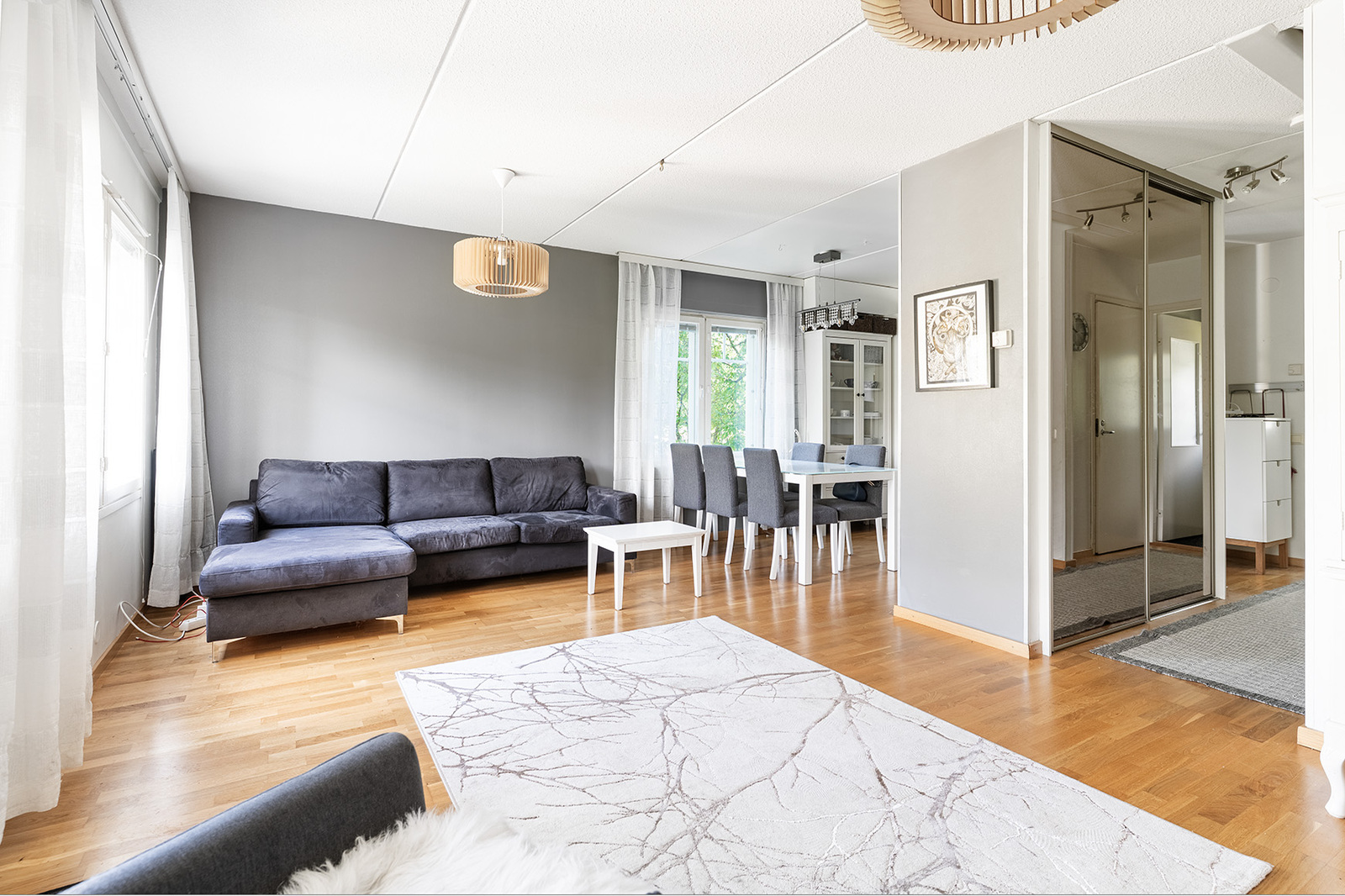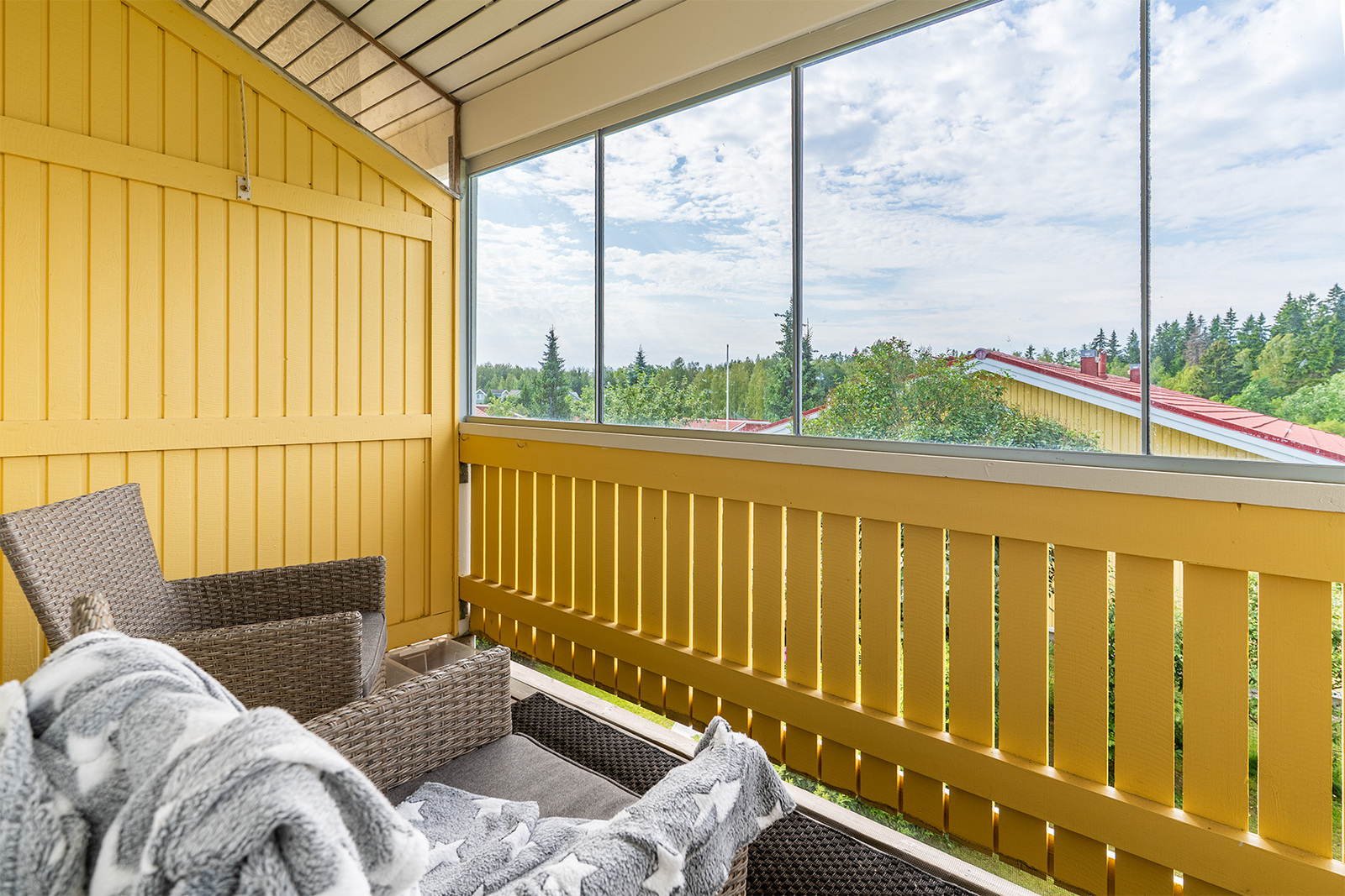 Kotiin kuuluu kolme makuuhuonetta, tilava olohuone, moderni keittiö sekä oma sauna, jossa rentoutua päivän päätteeksi. Asunnon parveke on lasitettu ja suuntautuu länteen, joten voit nauttia ilta-auringosta rauhassa. Lattiat ovat pääosin parkettia ja muovimattoa, mikä tuo lämpöä ja kodikkuutta sisustukseen.