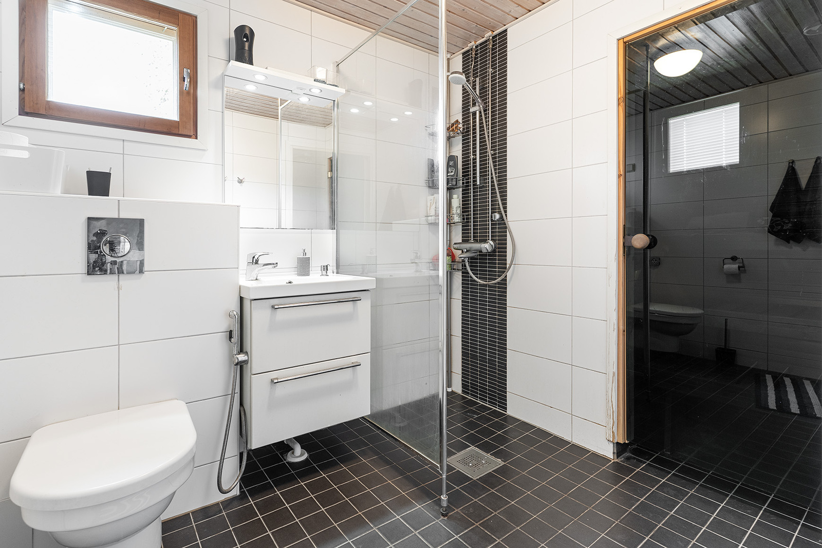 | Kylpyhuoneen kuvaus | Suihkuseinä, lattialämmitys, suihku, wc-istuin, peilikaappi ja kiinteät valaisimet, seinät (kaakeli), lattiat (laatta) |