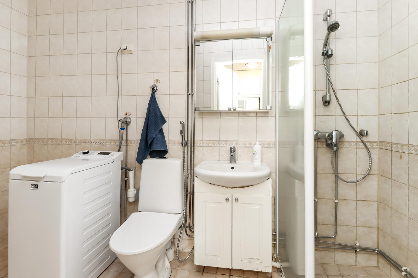 WC-istuin, allaskaappi, peilikaappi, suihkuseinä ja pesukoneliitäntä, seinät (kaakeli), lattiat (laatta) |