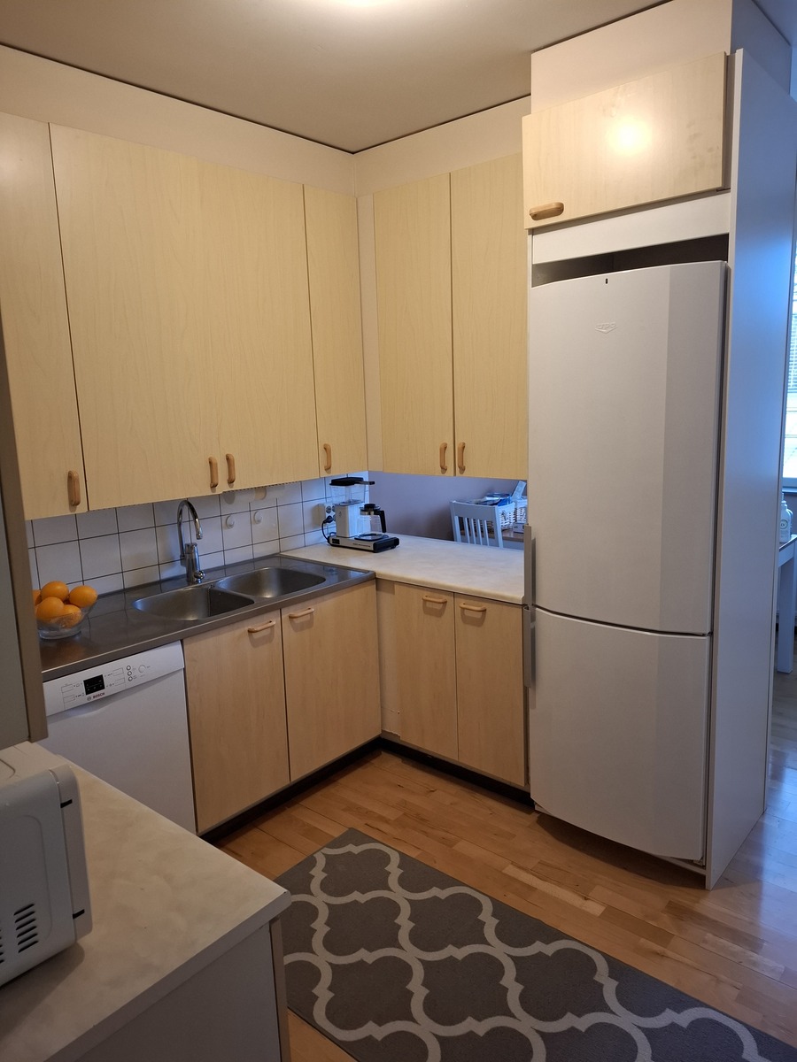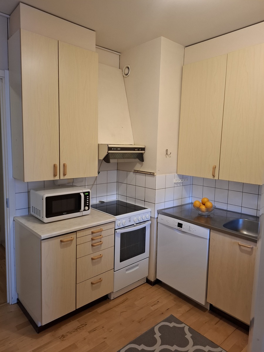 Liesi (Keraaminen liesi), seinät (maali ja laatta), lattiat (parketti), astianpesukone ja jääkaappipakastin |