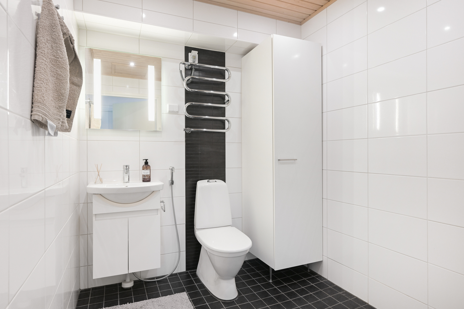 | Kylpyhuoneen kuvaus | Suihku, wc-istuin, peili, pesukoneliitäntä, suihkuseinä, allaskaappi ja kiinteät valaisimet, seinät (kaakeli), lattiat (laatta) |