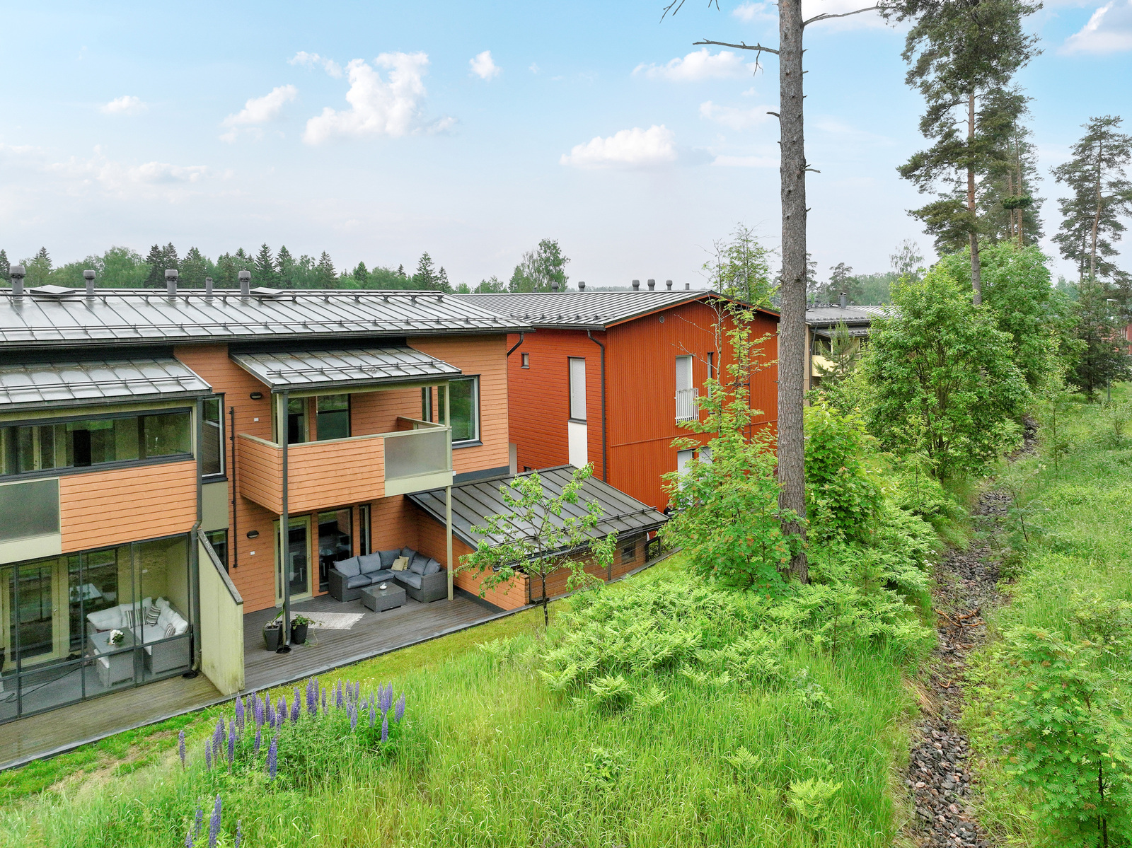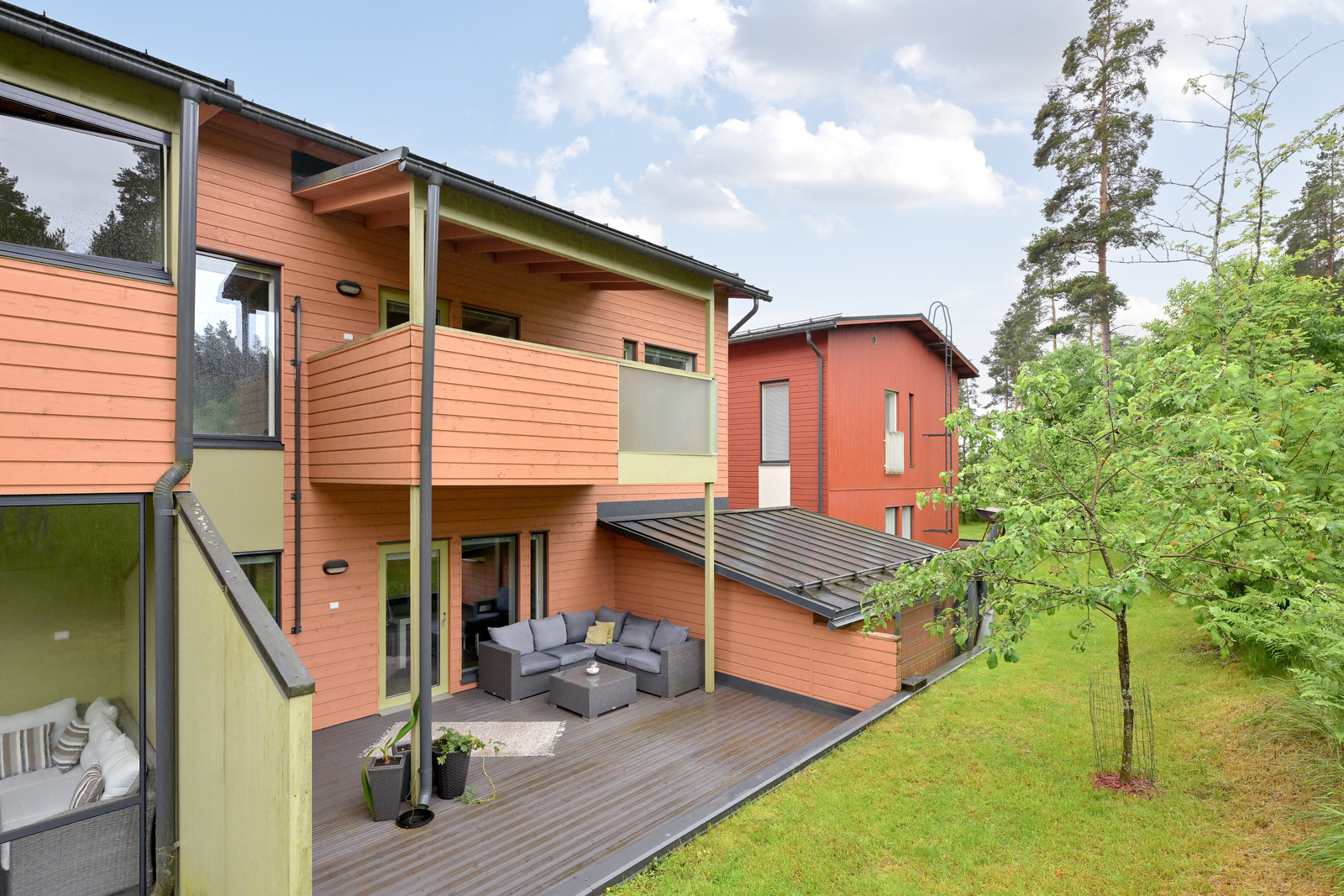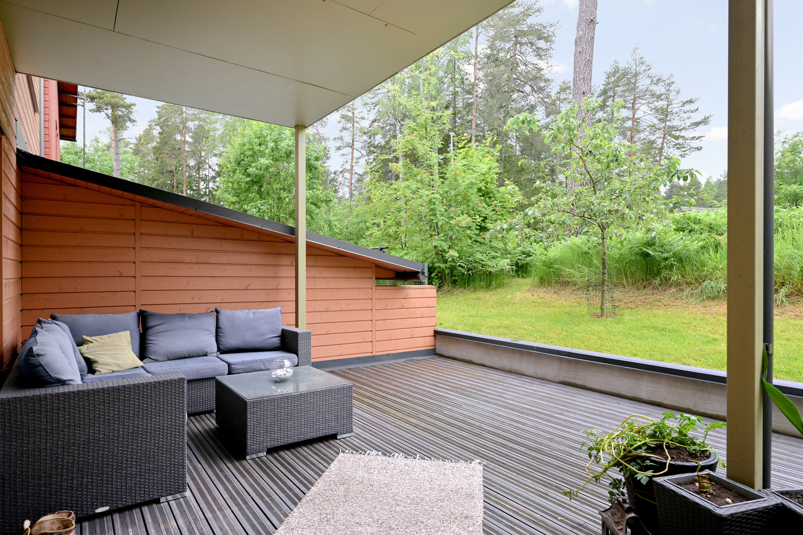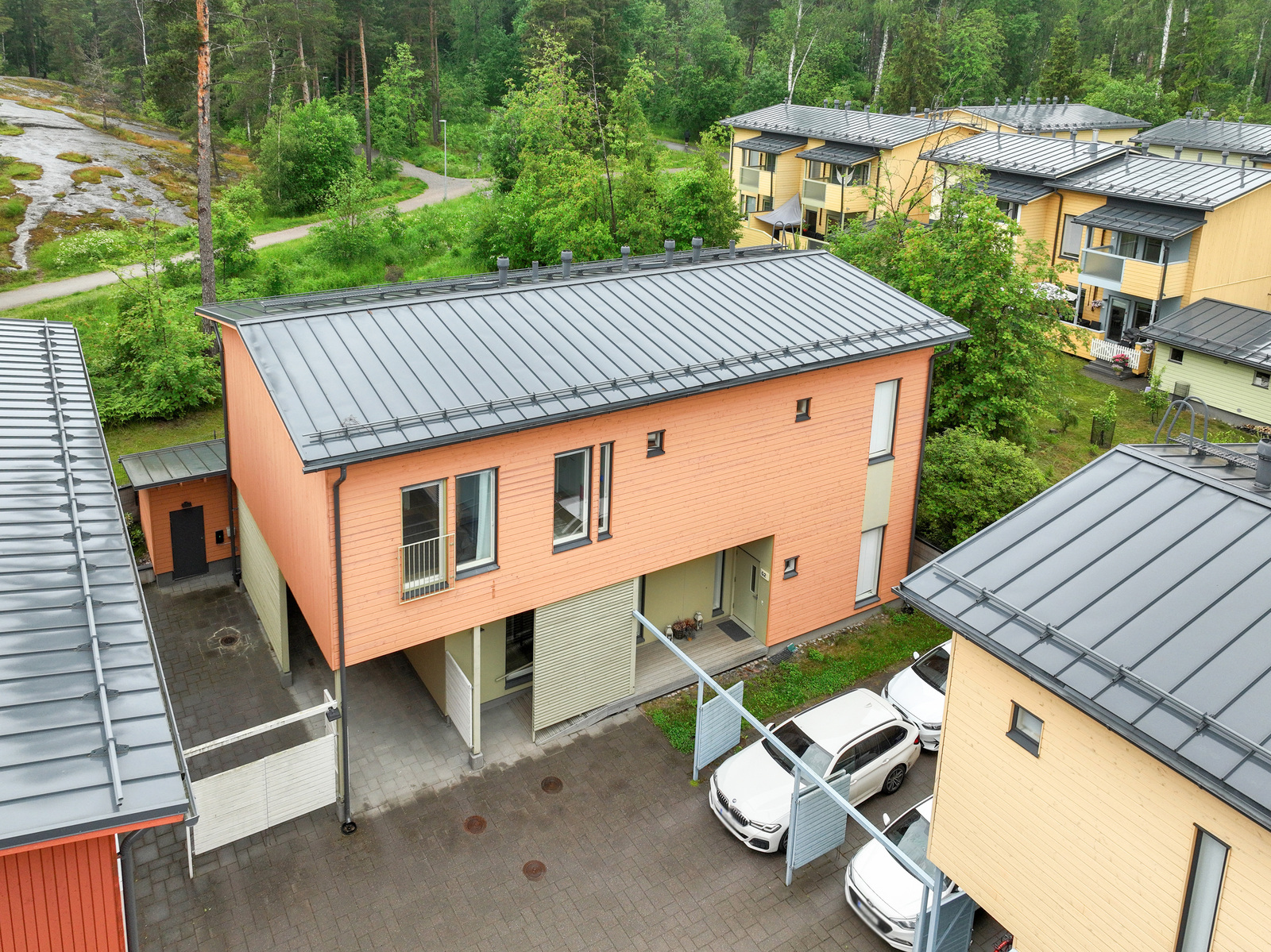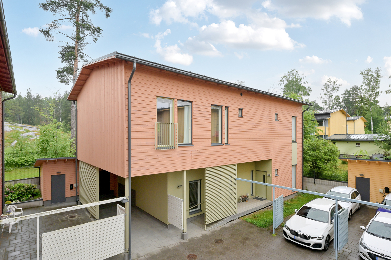 Alakerrassa sijaitsevat tilava eteinen, kylpyhuone sekä erillinen keittiö, joka yhdistyy portaiden kautta keskikerroksen ruokailu- ja oleskelutiloihin. Olohuoneesta avautuu käynti suojaisalle, osittain katetulle terassipihalle, joka rajautuu rauhalliseen puistoalueeseen, täydellinen paikka rentoutua luonnon helmassa.