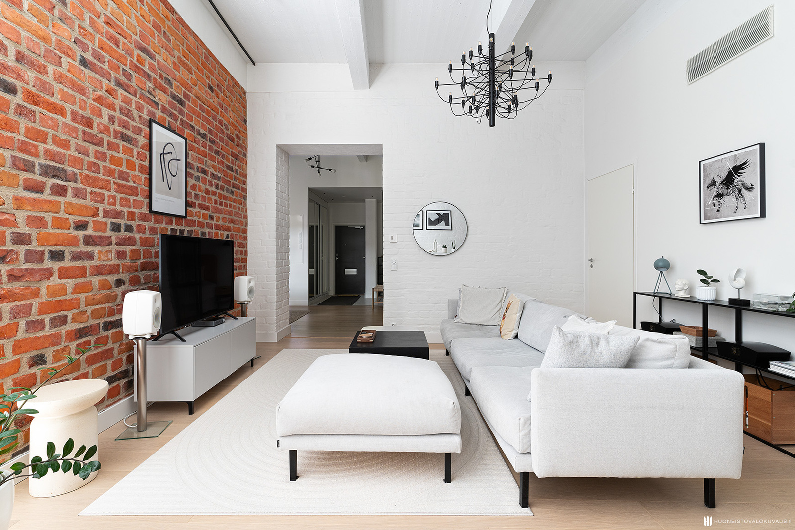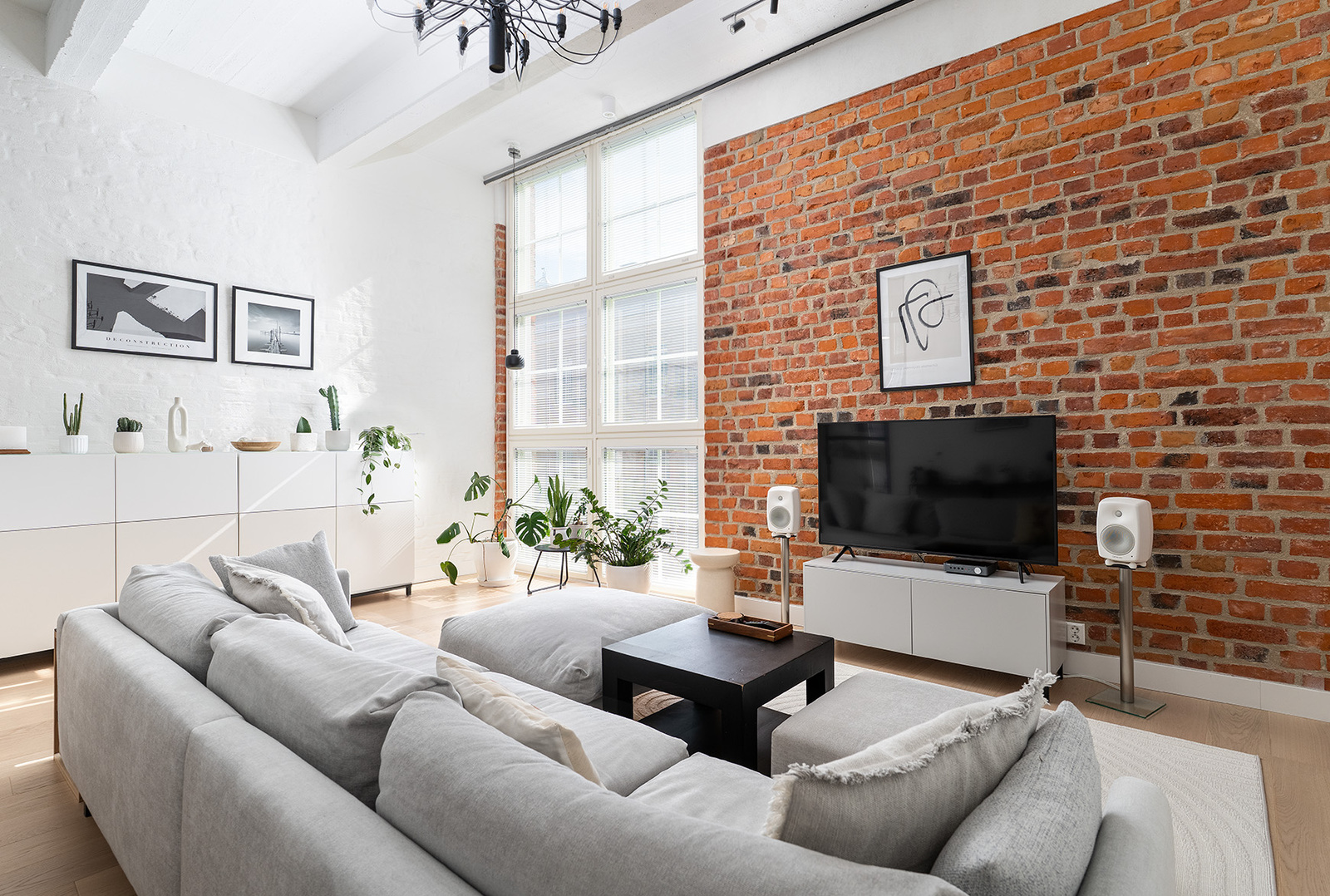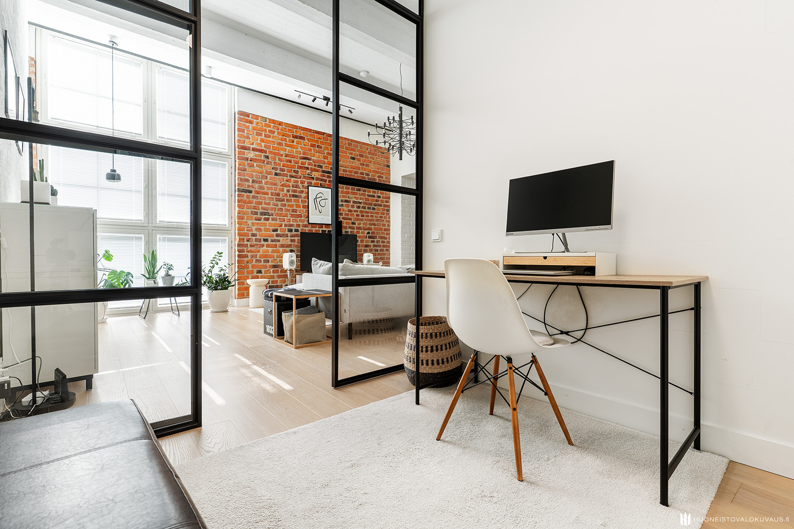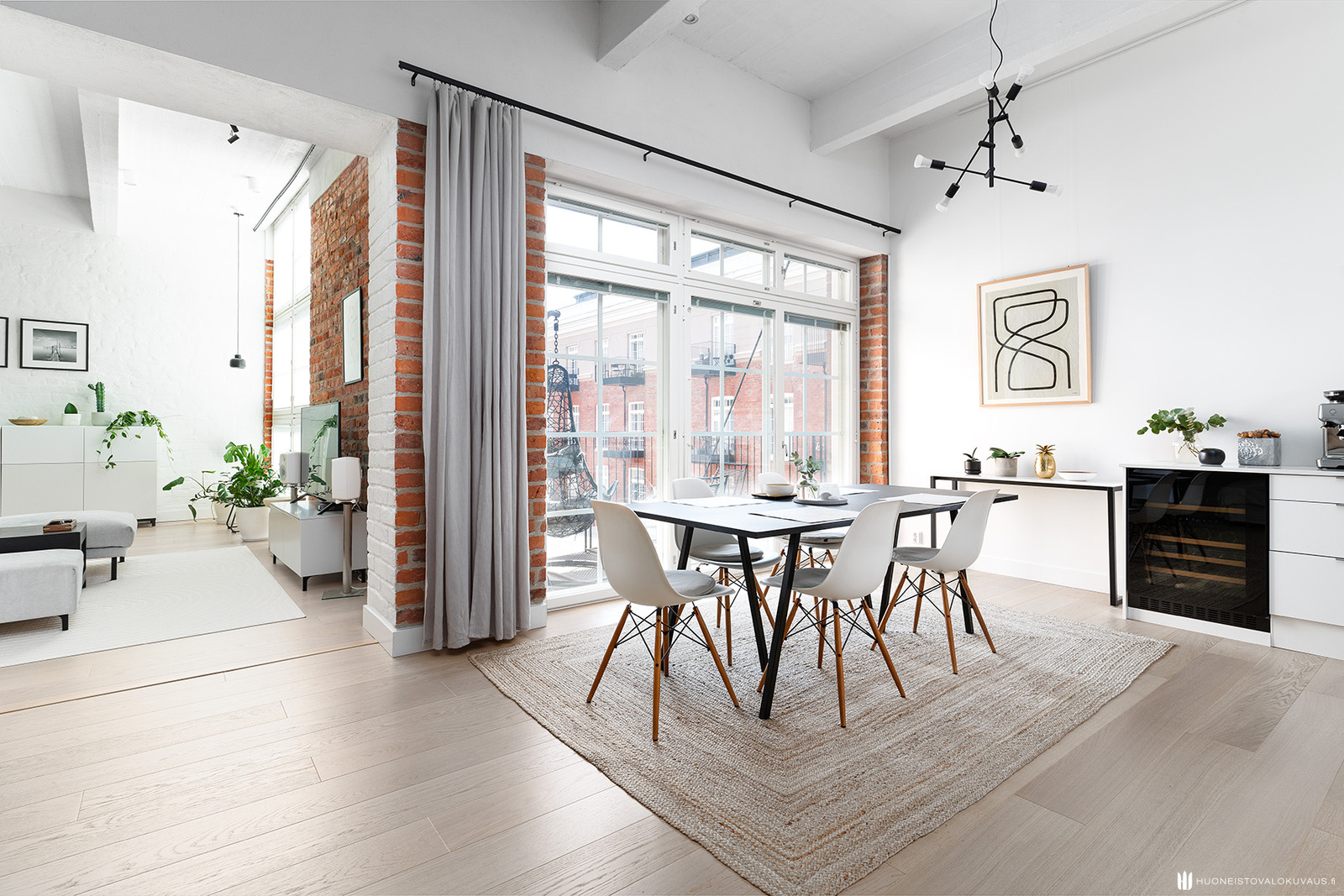 Mahtavasti tilaa, ja valoa tulvii lattiasta lähes kattoon jatkuvista ikkunoista. Olohuone, koko huoneiston sydän avaa näkymänsä viehättävälle sisäpihalle. Korkeat ikkunat, alkuperäiset vanhat tiiliseinät, pilarit ja palkit muistuttavat rakennuksen historiasta. Kansainvälisesti arvostetun sisustusarkkitehtitoimisto dSign Vertti Kivi & Co:n suunnittelema pelkistetty sisustus korostaa asunnon arkkitehtonisia yksityiskohtia.