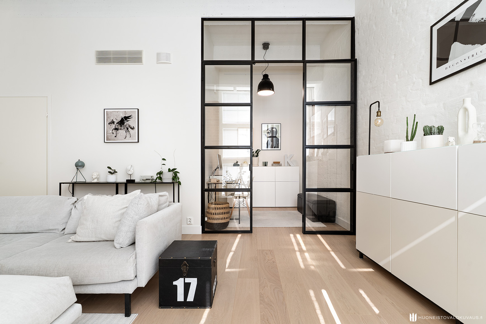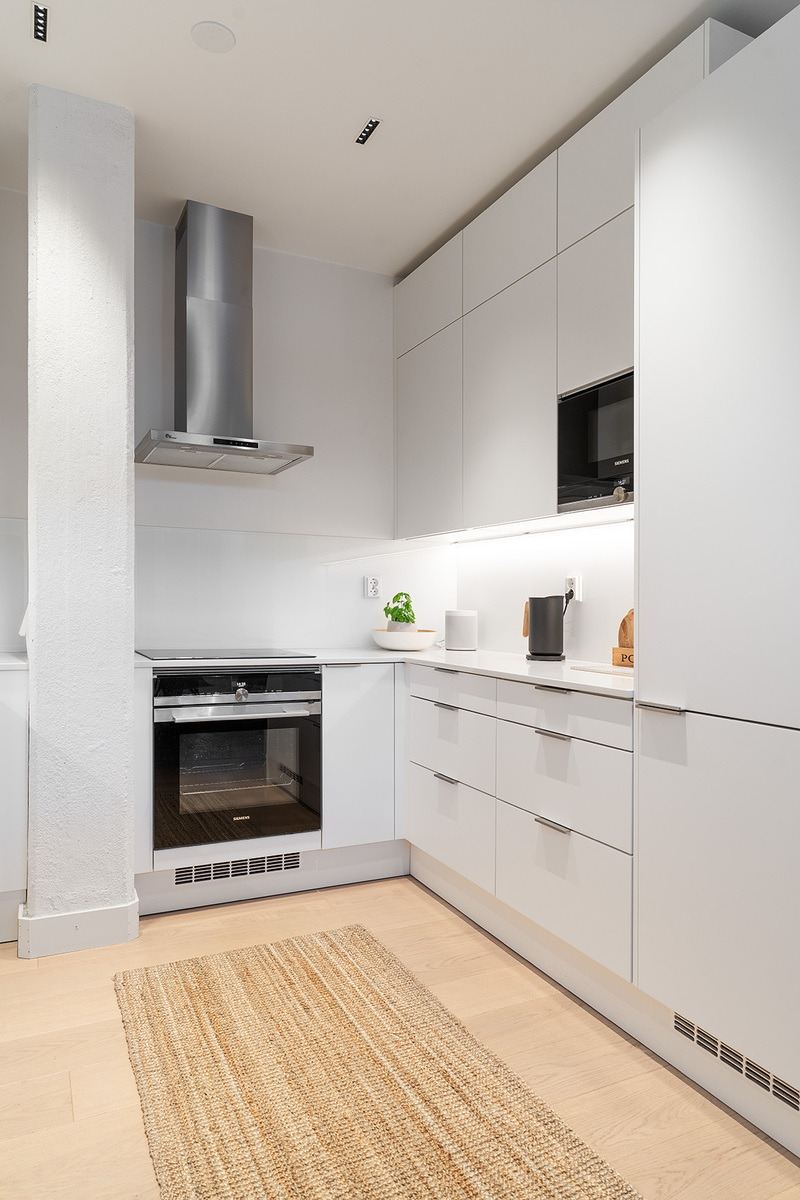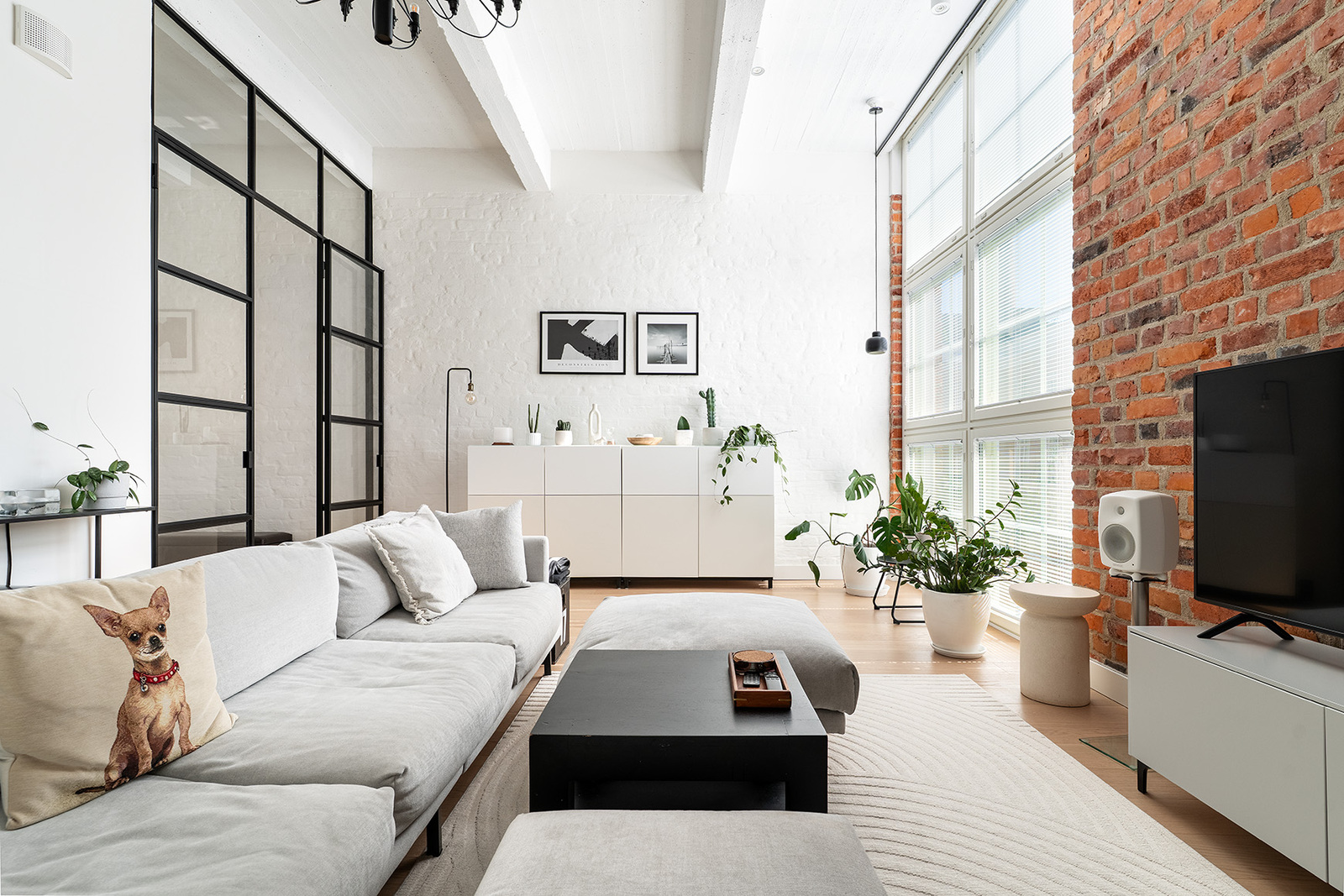 Mahtavasti tilaa, ja valoa tulvii lattiasta lähes kattoon jatkuvista ikkunoista. Olohuone, koko huoneiston sydän avaa näkymänsä viehättävälle sisäpihalle. Korkeat ikkunat, alkuperäiset vanhat tiiliseinät, pilarit ja palkit muistuttavat rakennuksen historiasta. Kansainvälisesti arvostetun sisustusarkkitehtitoimisto dSign Vertti Kivi & Co:n suunnittelema pelkistetty sisustus korostaa asunnon arkkitehtonisia yksityiskohtia.