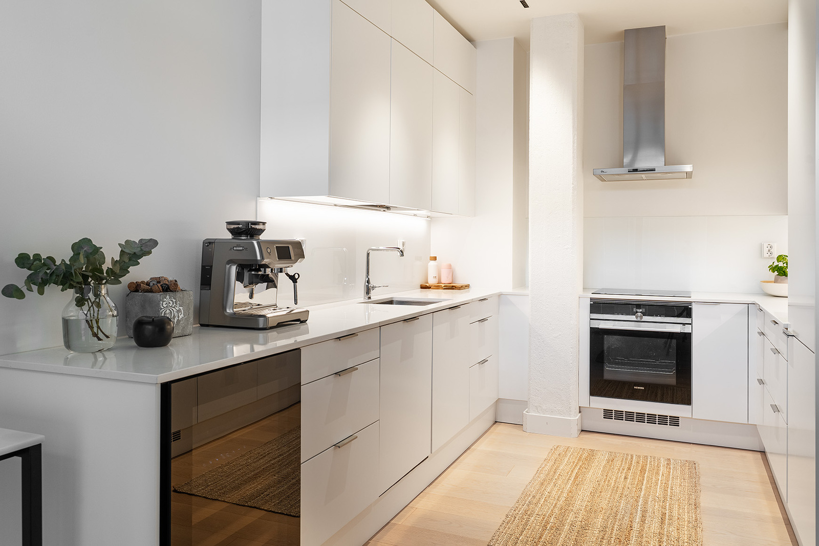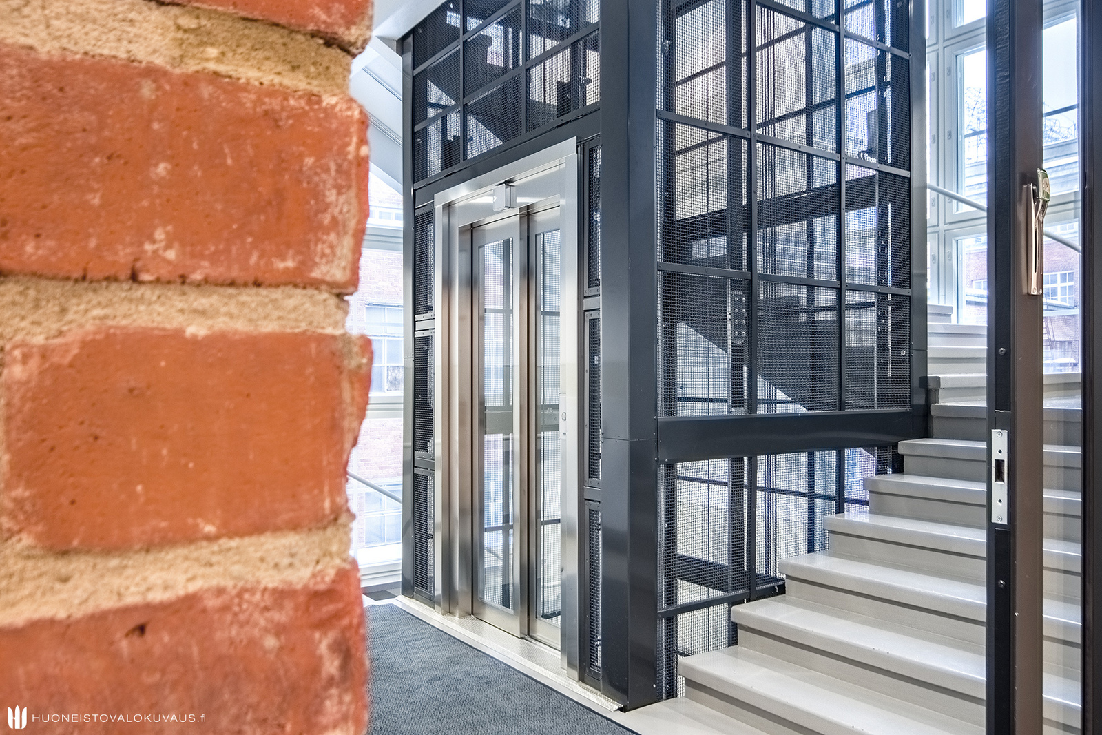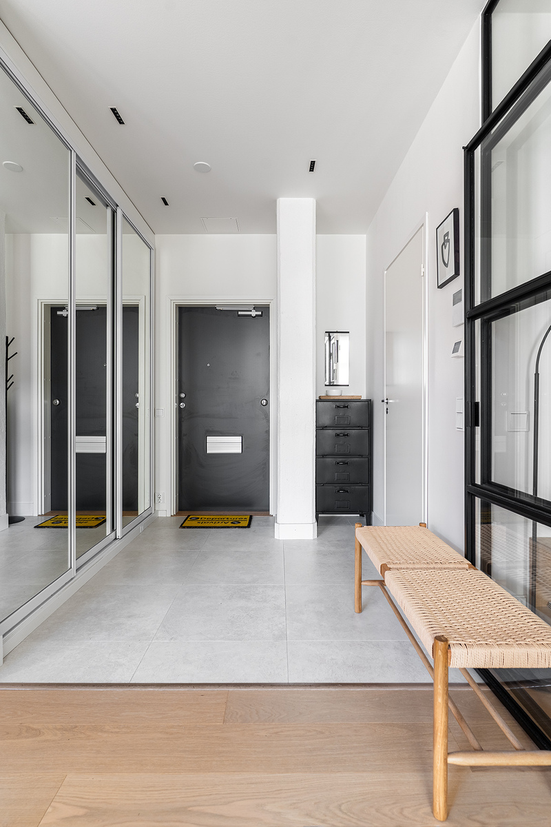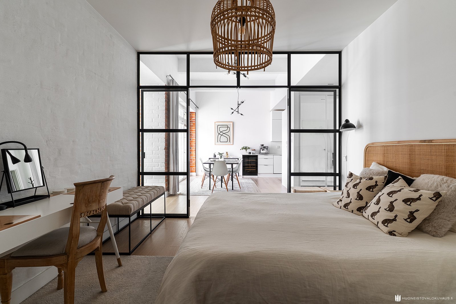 Mahtavasti tilaa, ja valoa tulvii lattiasta lähes kattoon jatkuvista ikkunoista. Olohuone, koko huoneiston sydän avaa näkymänsä viehättävälle sisäpihalle. Korkeat ikkunat, alkuperäiset vanhat tiiliseinät, pilarit ja palkit muistuttavat rakennuksen historiasta. Kansainvälisesti arvostetun sisustusarkkitehtitoimisto dSign Vertti Kivi & Co:n suunnittelema pelkistetty sisustus korostaa asunnon arkkitehtonisia yksityiskohtia.