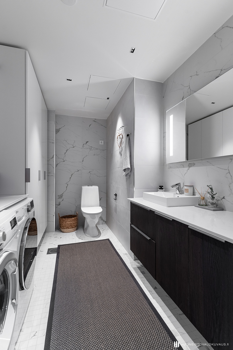 | Kylpyhuoneen kuvaus | Lattialämmitys, pesukoneliitäntä, suihkuseinä, wc-istuin, allaskaappi, peili, suihku ja kiinteät valaisimet, seinät (kaakeli), lattiat (laatta) |