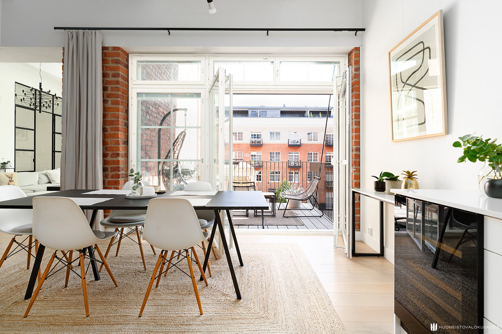 Ranskalaistyyliset kaksoisovet yhdistävät ruokailutilan tilavaan parvekkeeseen, joka luo täydelliset puitteet kesäisille aamukahveille tai isommillekin juhlille.