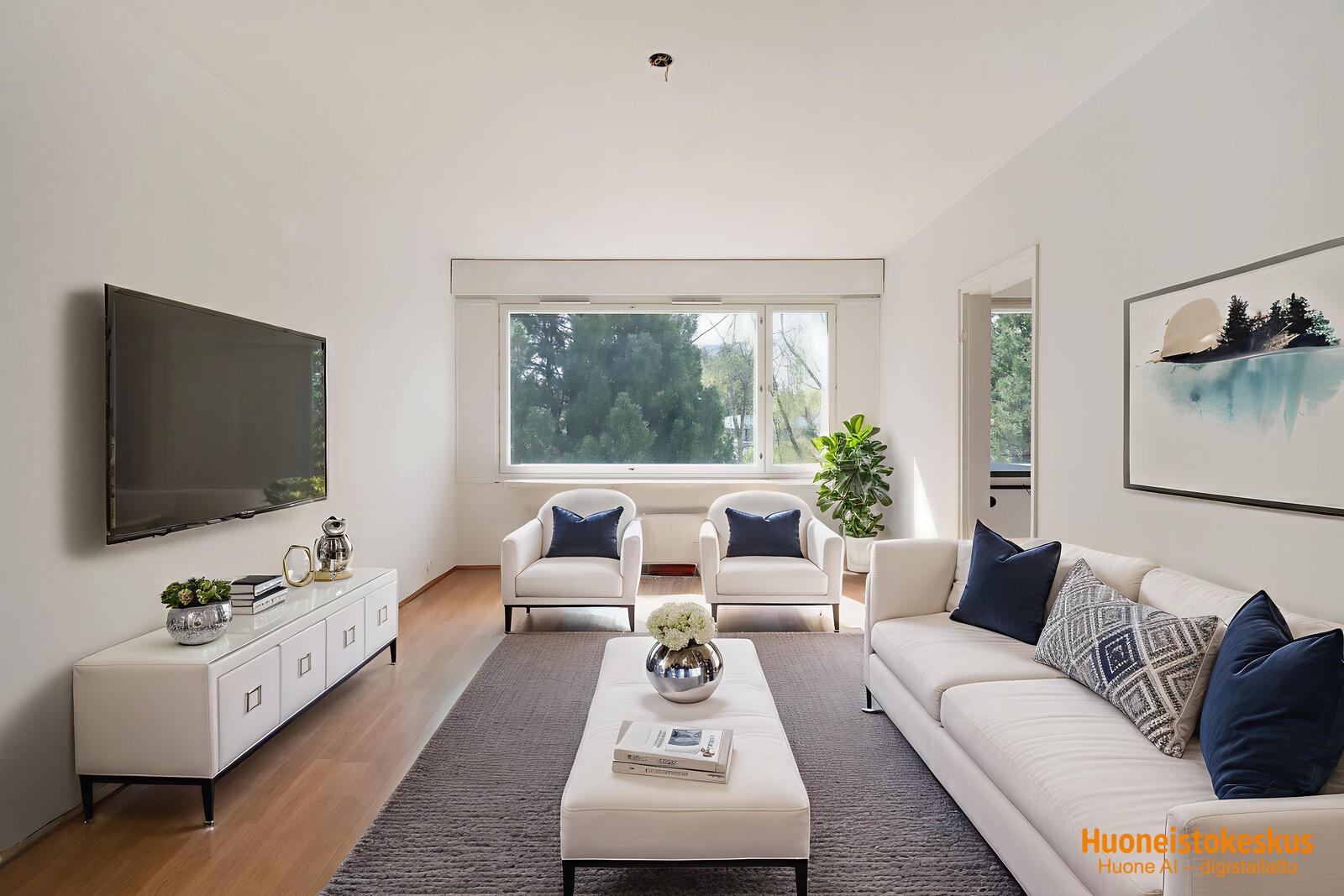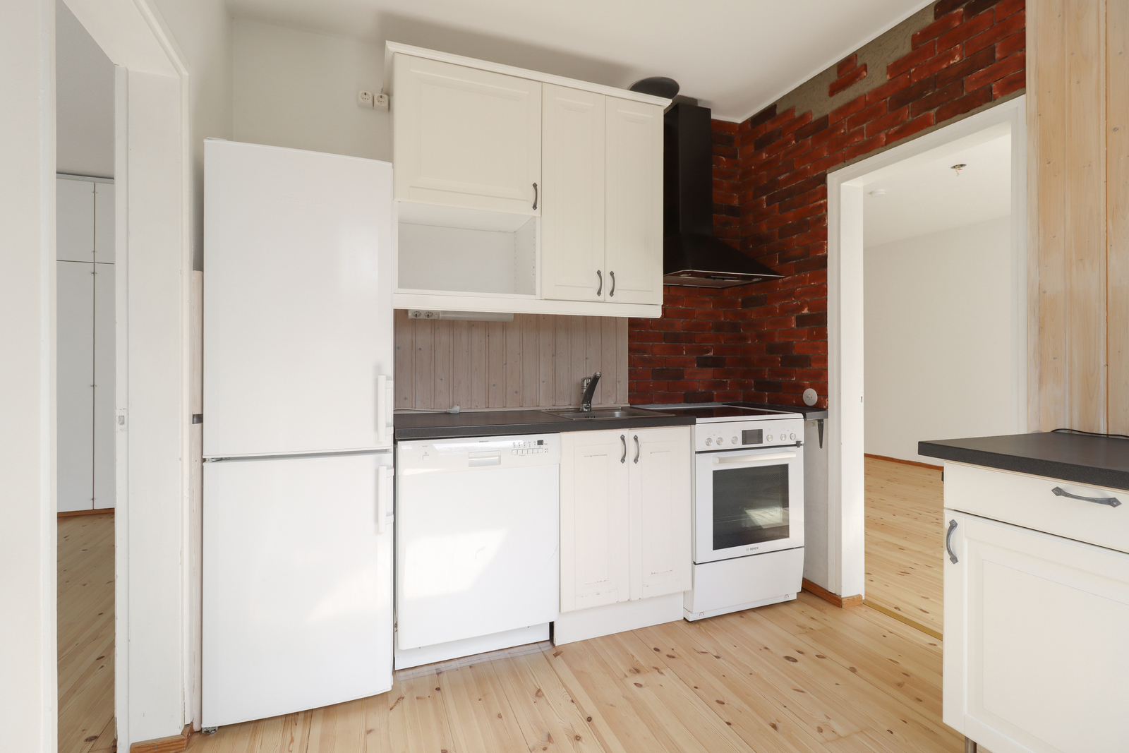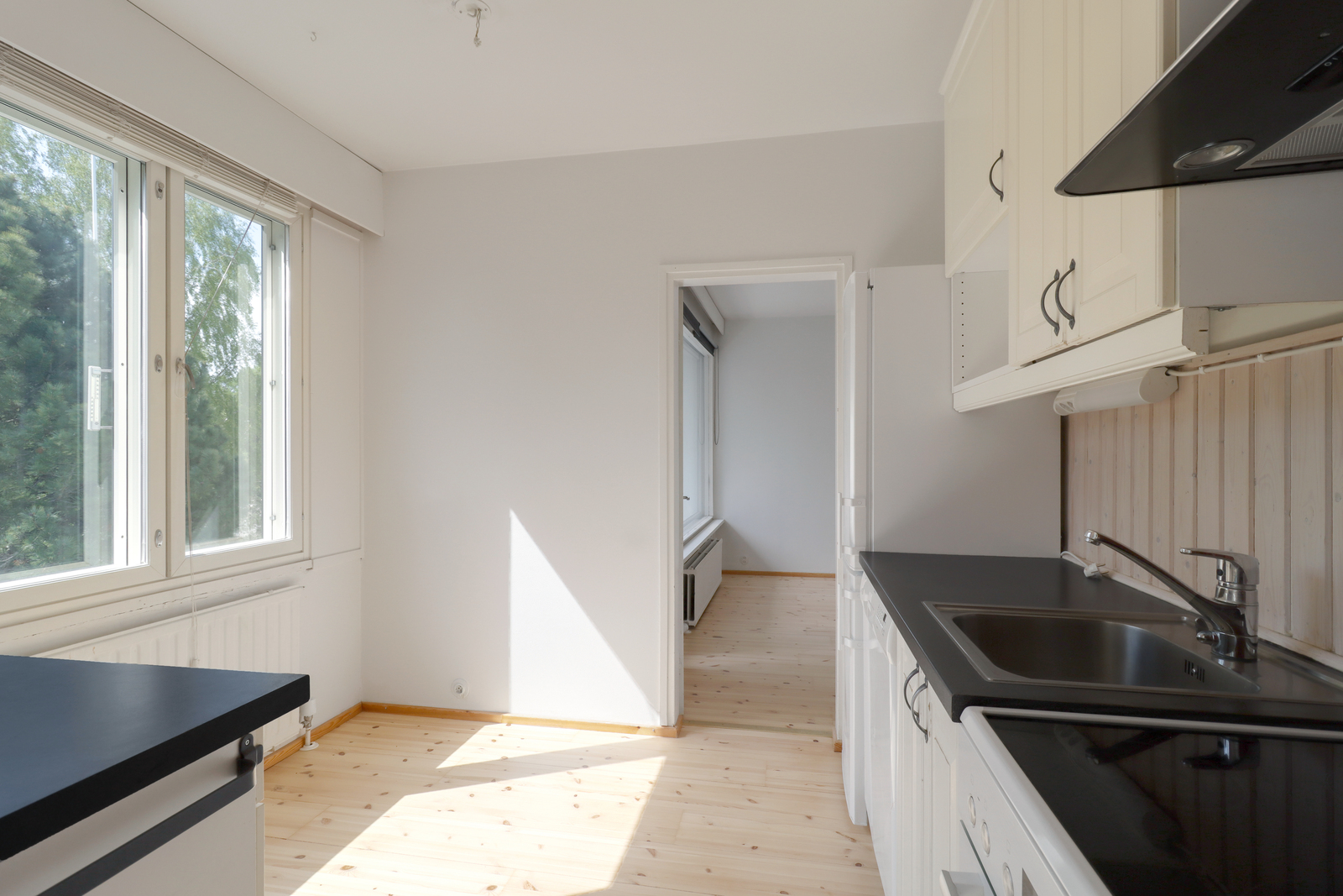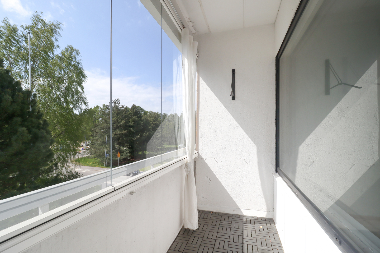 Valoisuuden ansiosta, sekä tilava makuuhuone, että olohuone on helppo sisustaa, ja kompaktiin keittiöön mahtuu hyvin ruokapöytäkin. Asunnosta löytyy tarvittaessa tilaa varmasti myös työsopelle ja kokonaisuuden kruunaa lasitettu parveke. Väljästi rakennettujen talojen vuoksi näkymä on mukavan puistomainen.