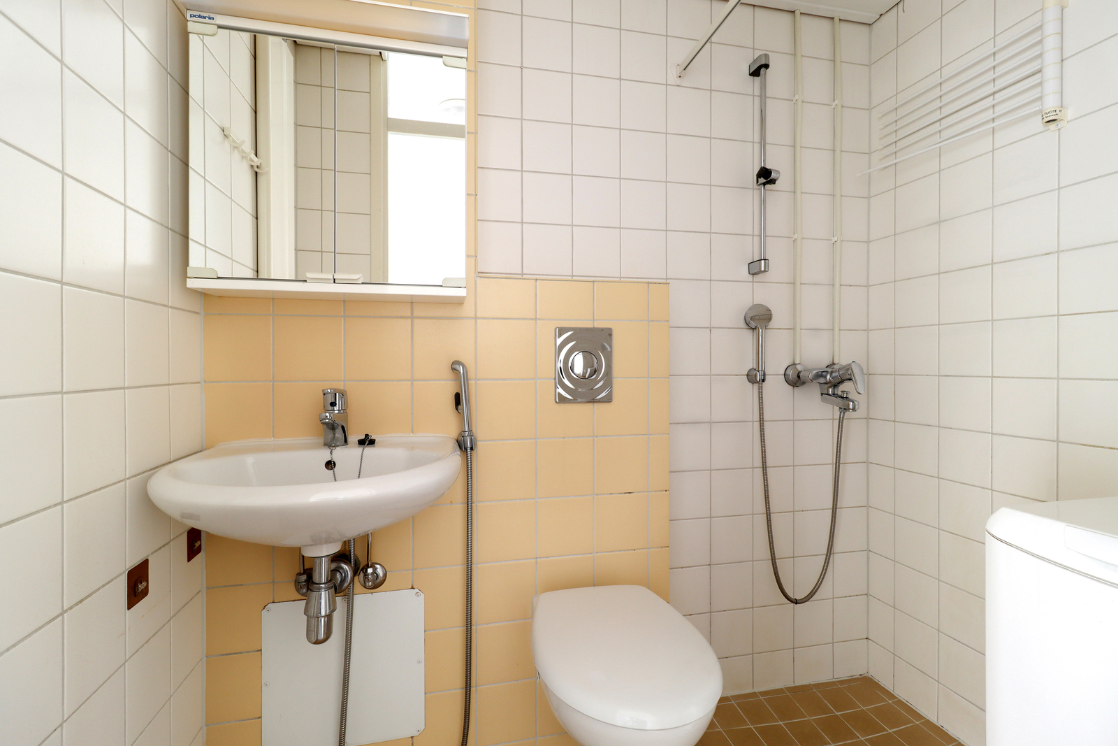 | Kylpyhuoneen kuvaus | Pesukone, pesukoneliitäntä, wc-istuin, peilikaappi, suihku, lattialämmitys ja kiinteät valaisimet, seinät (kaakeli), lattiat (laatta) |