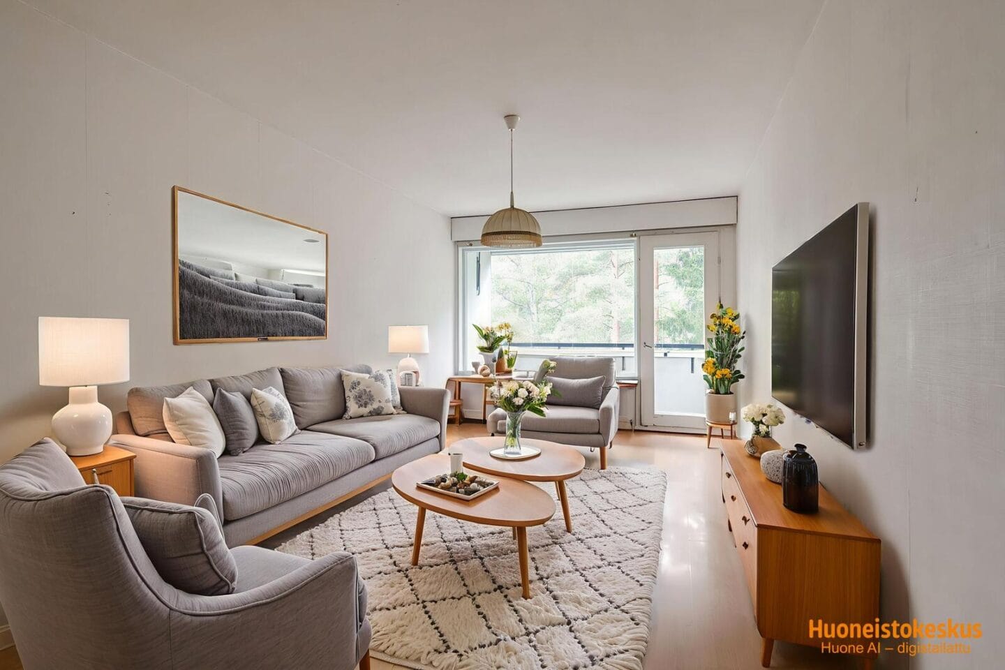 | Olohuoneen kuvaus | Seinät (tapetti), lattiat (laminaatti) |