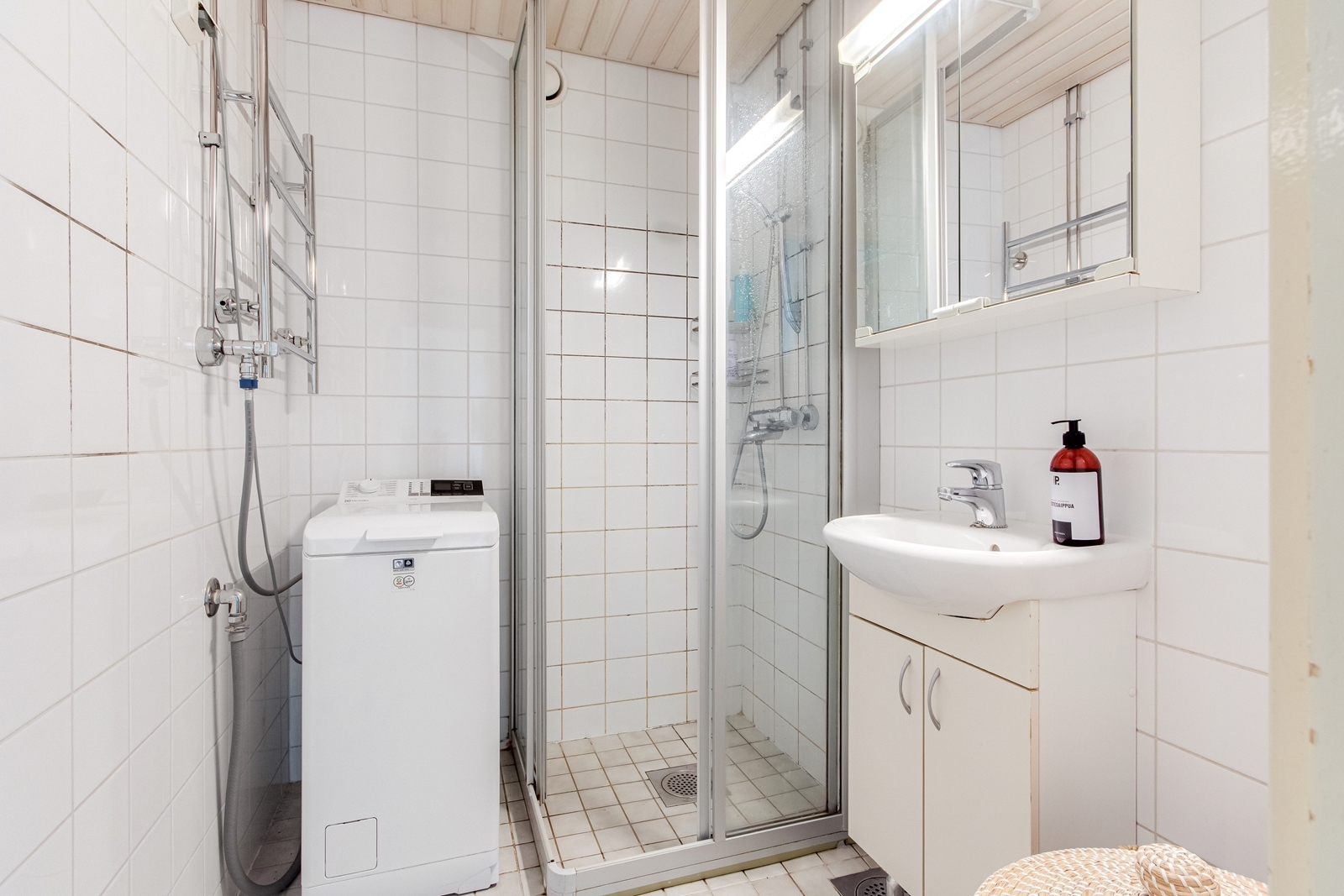 | Kylpyhuoneen kuvaus | Suihkukaappi, pesukoneliitäntä, peilikaappi, suihku ja kiinteät valaisimet, seinät (kaakeli), lattiat (laatta) |