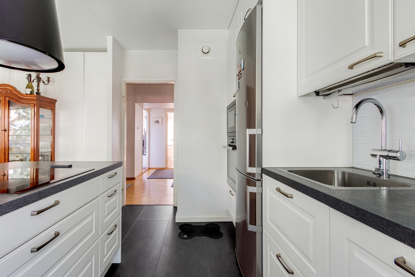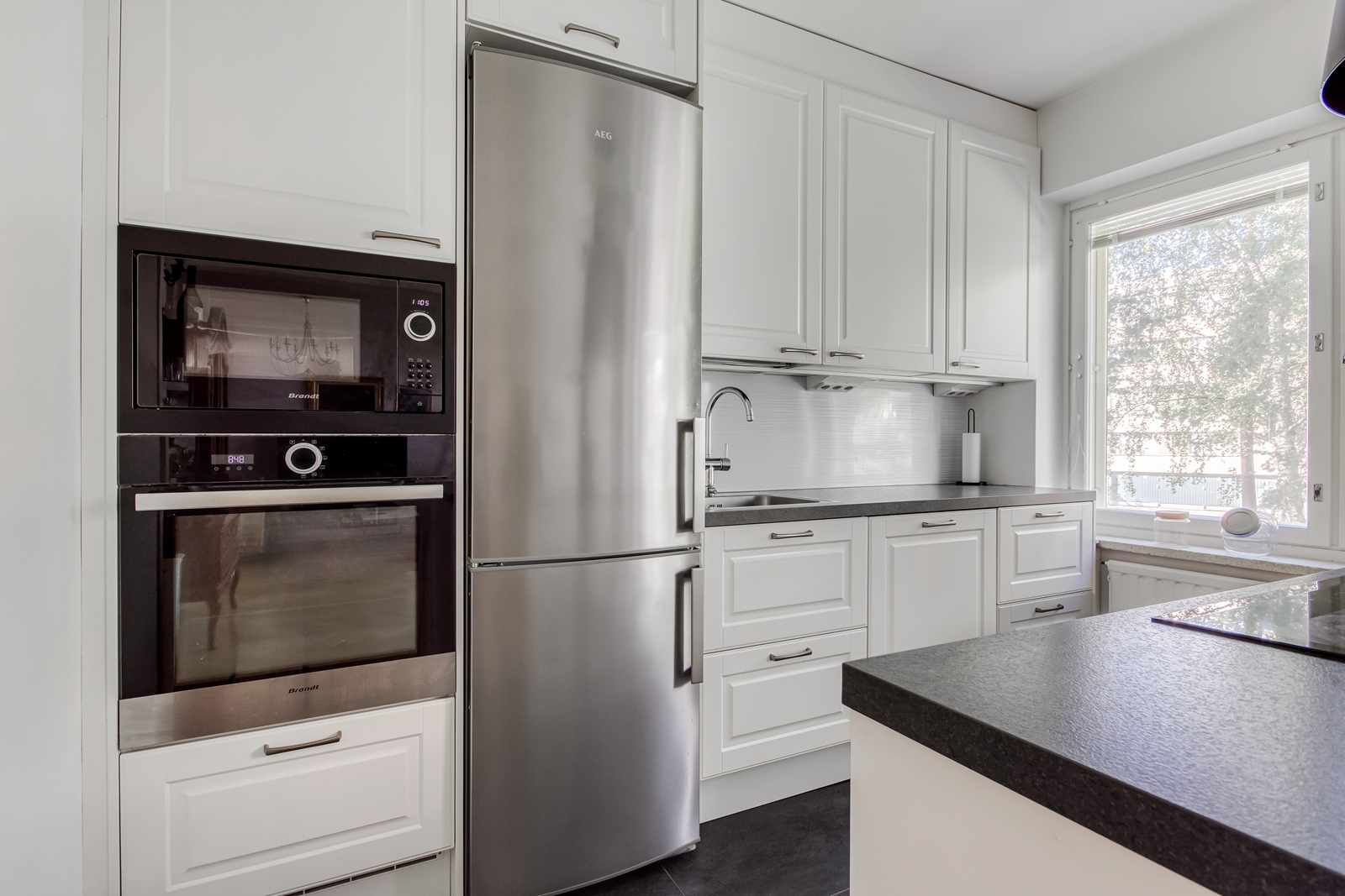 | Keittiön kuvaus | Liesi (Induktioliesi ja liesitaso), seinät (maali ja osalaatoitus), lattiat (vinyylikorkki), liesi, liesituuletin, astianpesukone, jääkaappipakastin ja liesitaso, kiinteät valaisimet |
