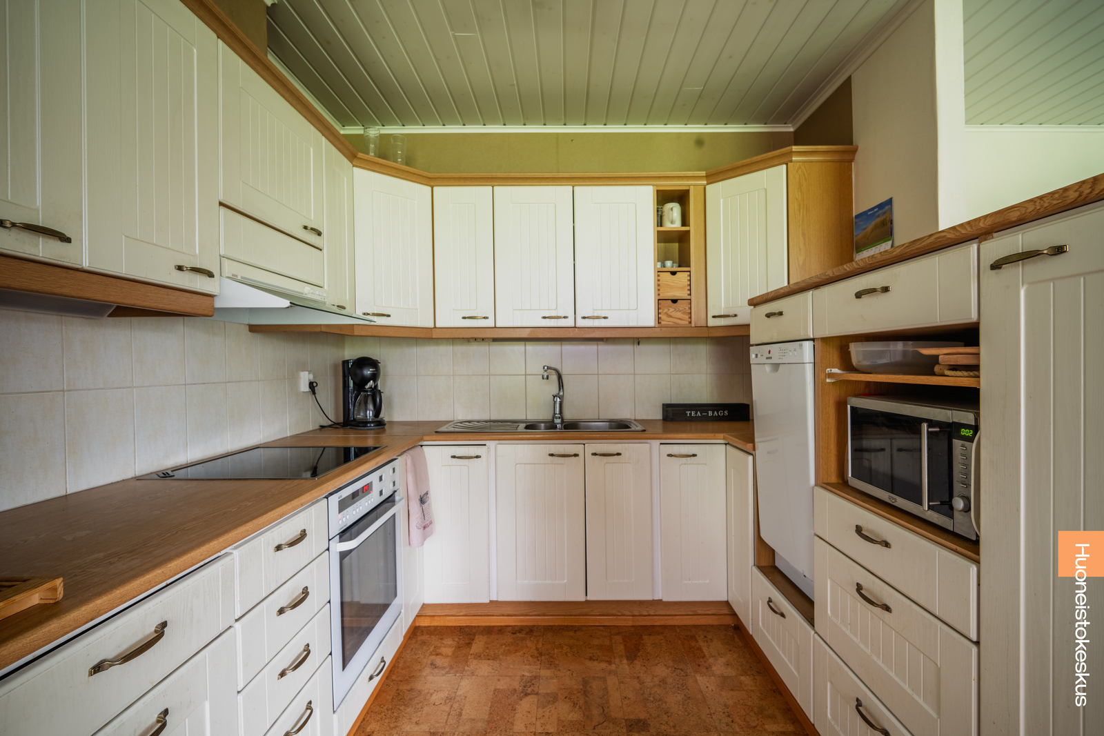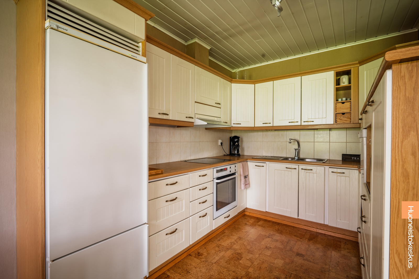| Keittiön kuvaus | Liesi (sähköliesi), työtasot (laminaatti), seinät (tapetti), lattiat (korkki), liesituuletin, liesi, jääkaappipakastin ja astianpesukone |