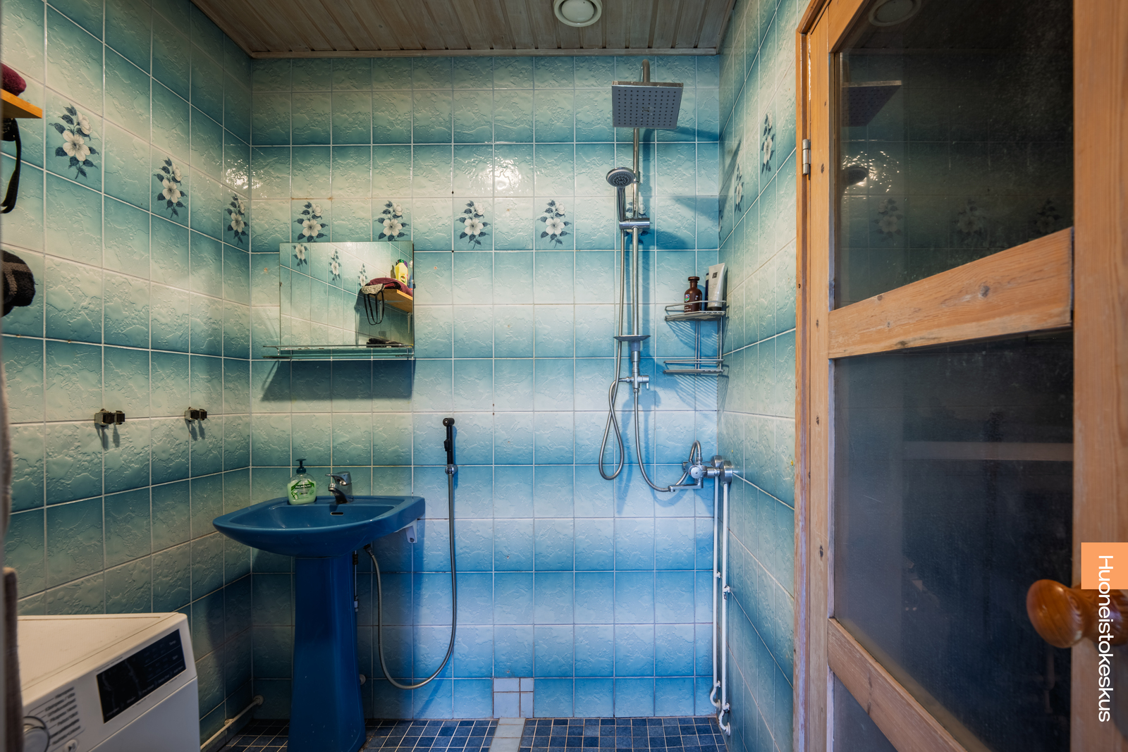 | Kylpyhuoneen kuvaus | Suihku, lattialämmitys ja kiinteät valaisimet, seinät (kaakeli), lattiat (laatta) |