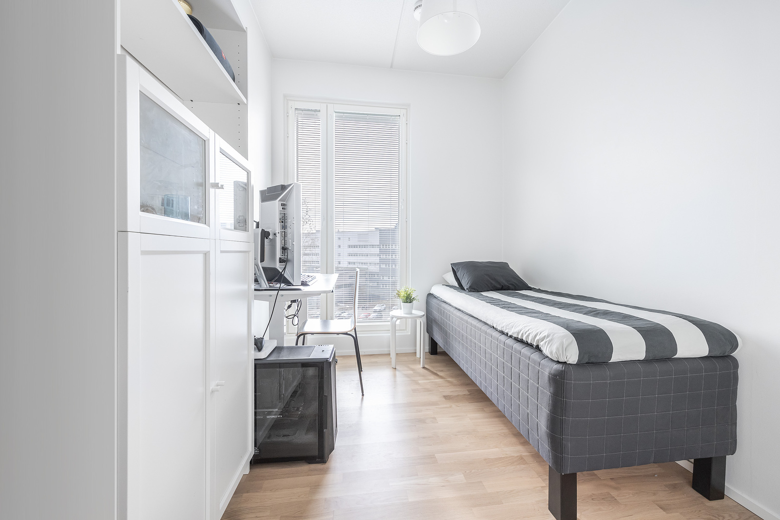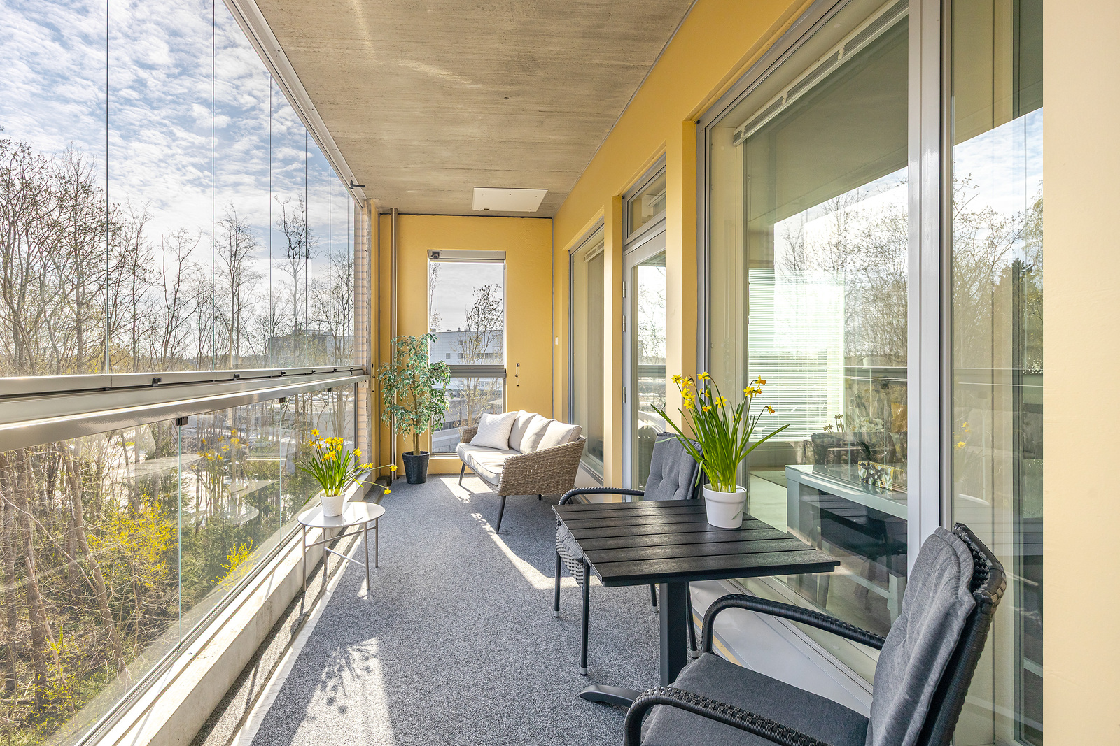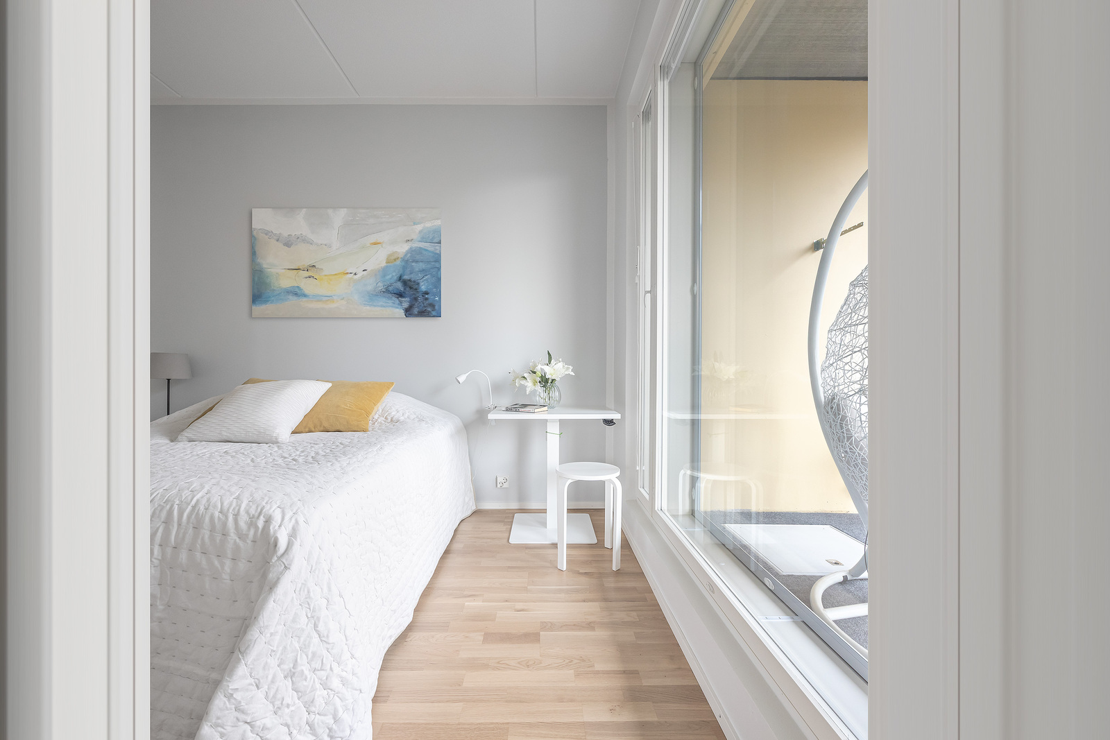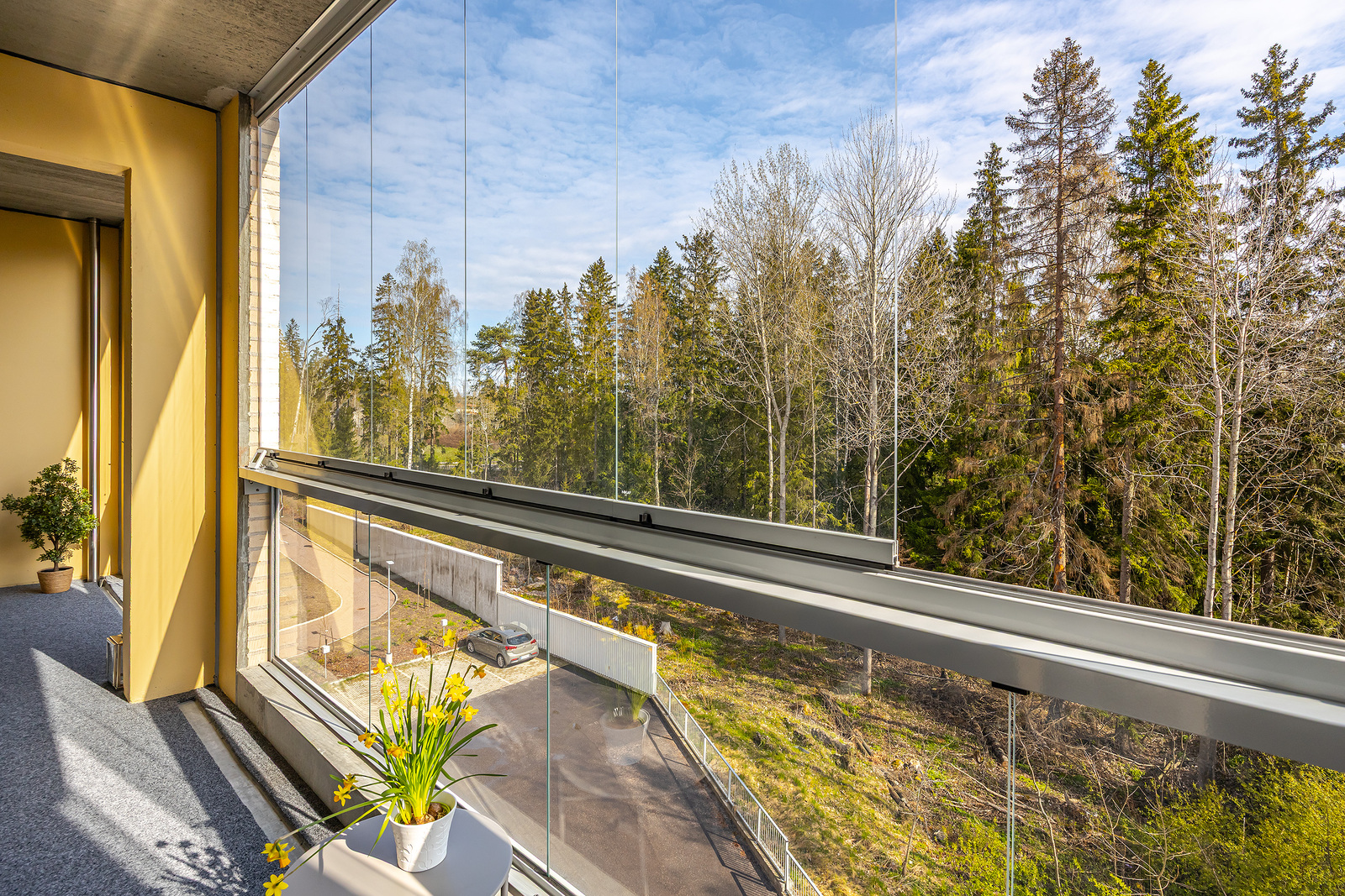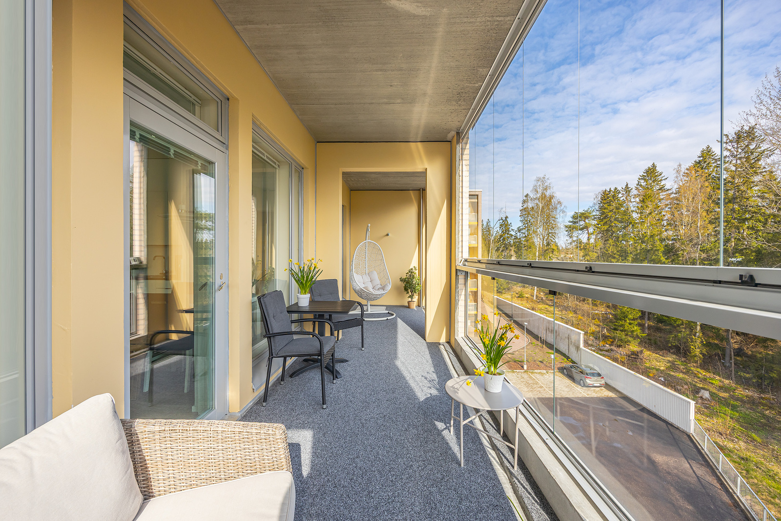 Tämä neljännen kerroksen kulmahuoneisto ihastuttaa avaruudellaan ja valoisuudellaan. Asunnossa on näyttävät, lähes lattiasta kattoon olevat ikkunat, joista avautuvat näkymät kahteen suuntaan. Tilanjako on selkeä, tehokas ja toimii monenlaisiin asumisen tarpeisiin. Sisustamista helpottaa seinäpattereiden puuttuminen, sillä asunnossa on vesikiertoinen lattialämmitys. Asunnon ehdoton plussa on ylellisen suuri, yli 16 m2, lasitettu parveke, jossa pääset nauttimaan aamupäivän auringosta!