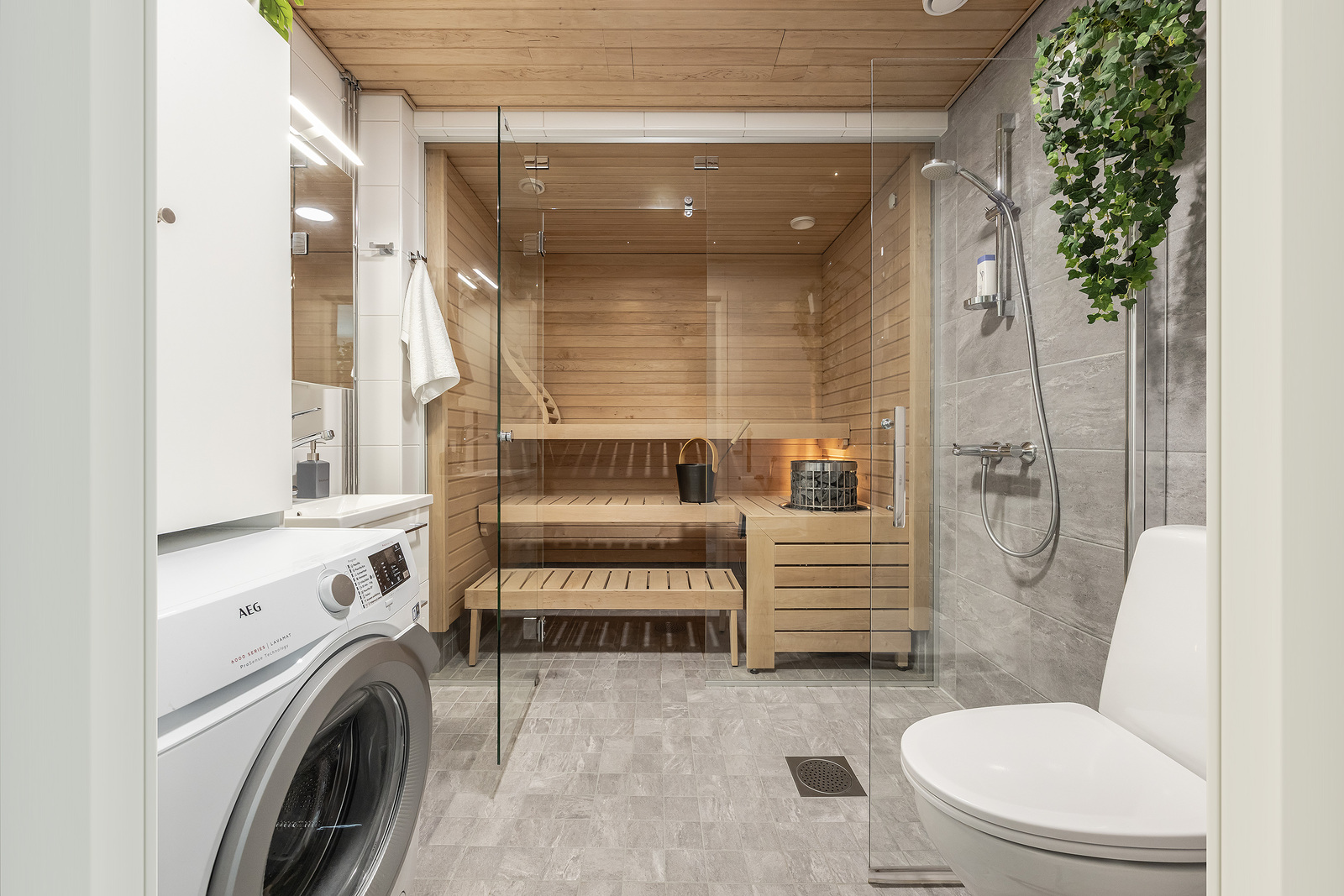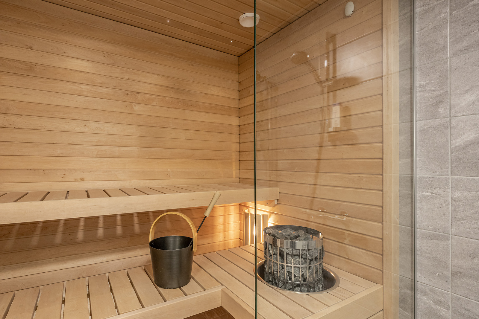 | Saunan kuvaus | Tyylikäs sauna, jossa sähkökiuas. |