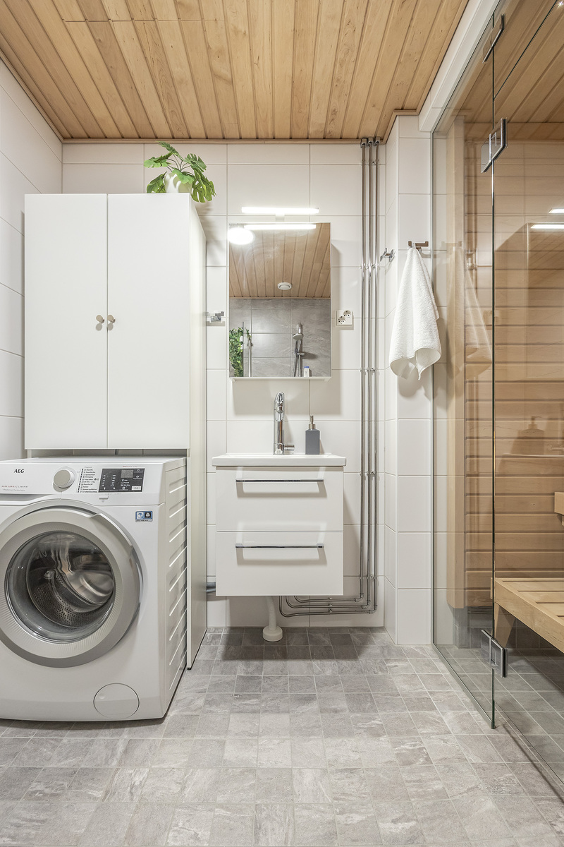 | Seinämateriaalien kuvaus | Maali: eteinen, keittiötila ja makuuhuoneet. Laatta: kylpyhuone Paneeli: sauna |