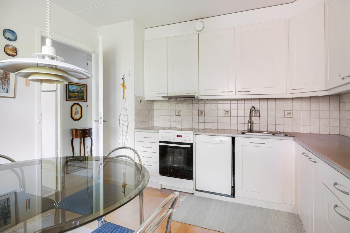 | Keittiön kuvaus | Liesi (sähköliesi), työtasot (laminaatti), seinät (maali), lattiat (laminaatti), jääkaappi, erillinen pakastin, liesi, liesituuletin ja astianpesukone, Vaaleat kaapistot, vaaleat välitilalaatat, beessit tasot. |