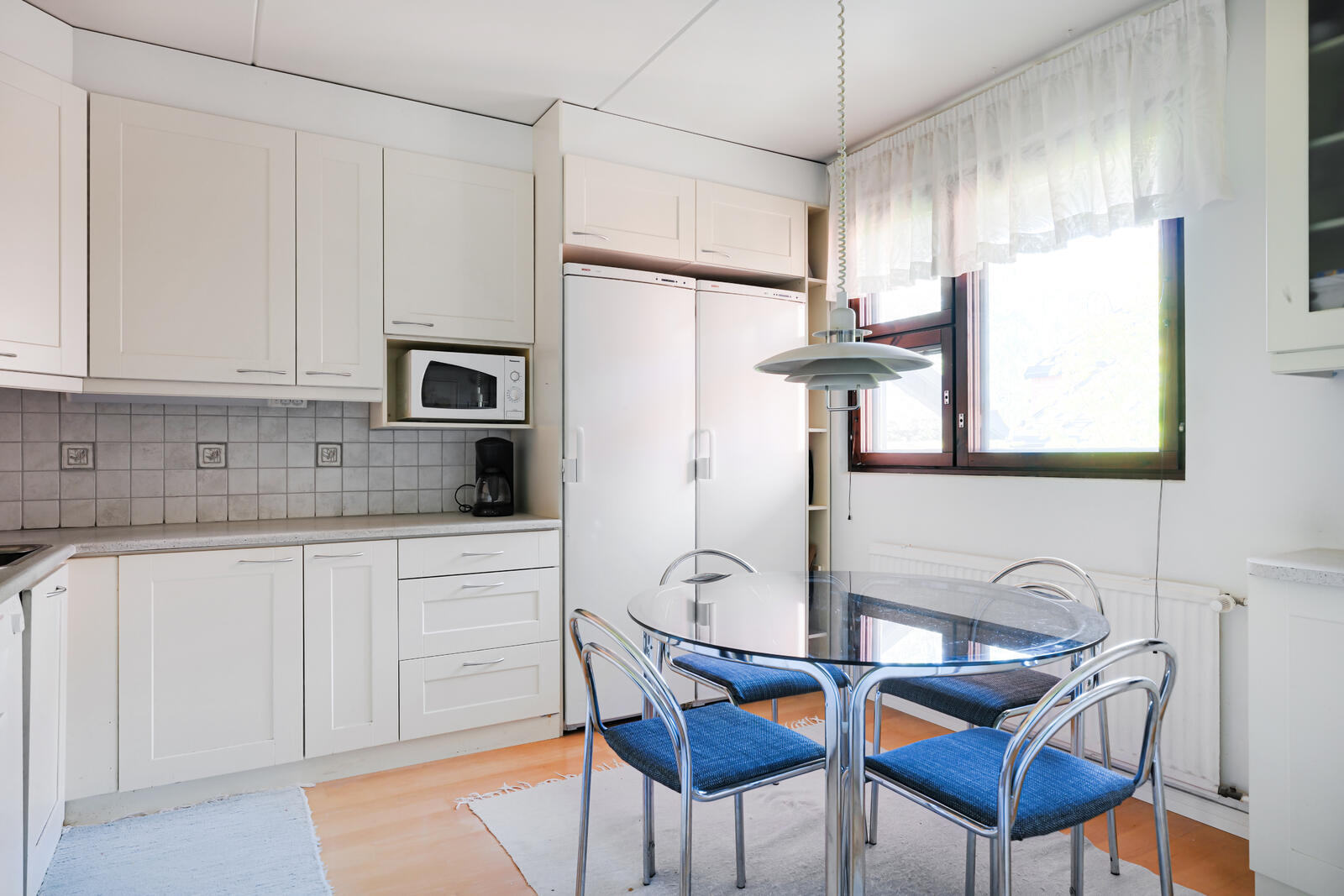 | Keittiön kuvaus | Liesi (sähköliesi), työtasot (laminaatti), seinät (maali), lattiat (laminaatti), jääkaappi, erillinen pakastin, liesi, liesituuletin ja astianpesukone |