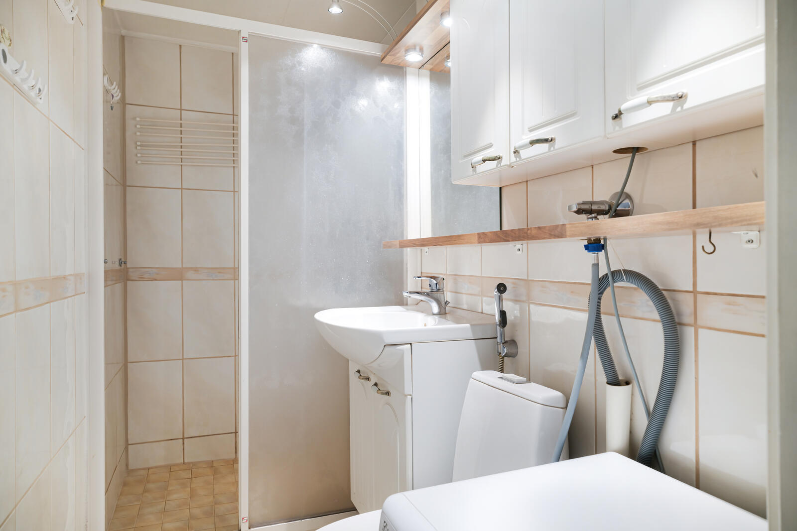 | Kylpyhuoneen kuvaus | Suihku, allaskaappi, peili, suihkuseinä, wc-istuin, pesukoneliitäntä, pesukone ja kiinteät valaisimet, seinät (kaakeli), lattiat (laatta) |