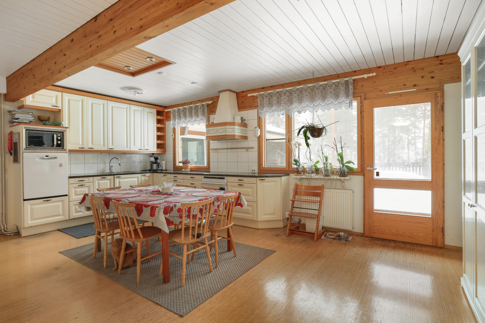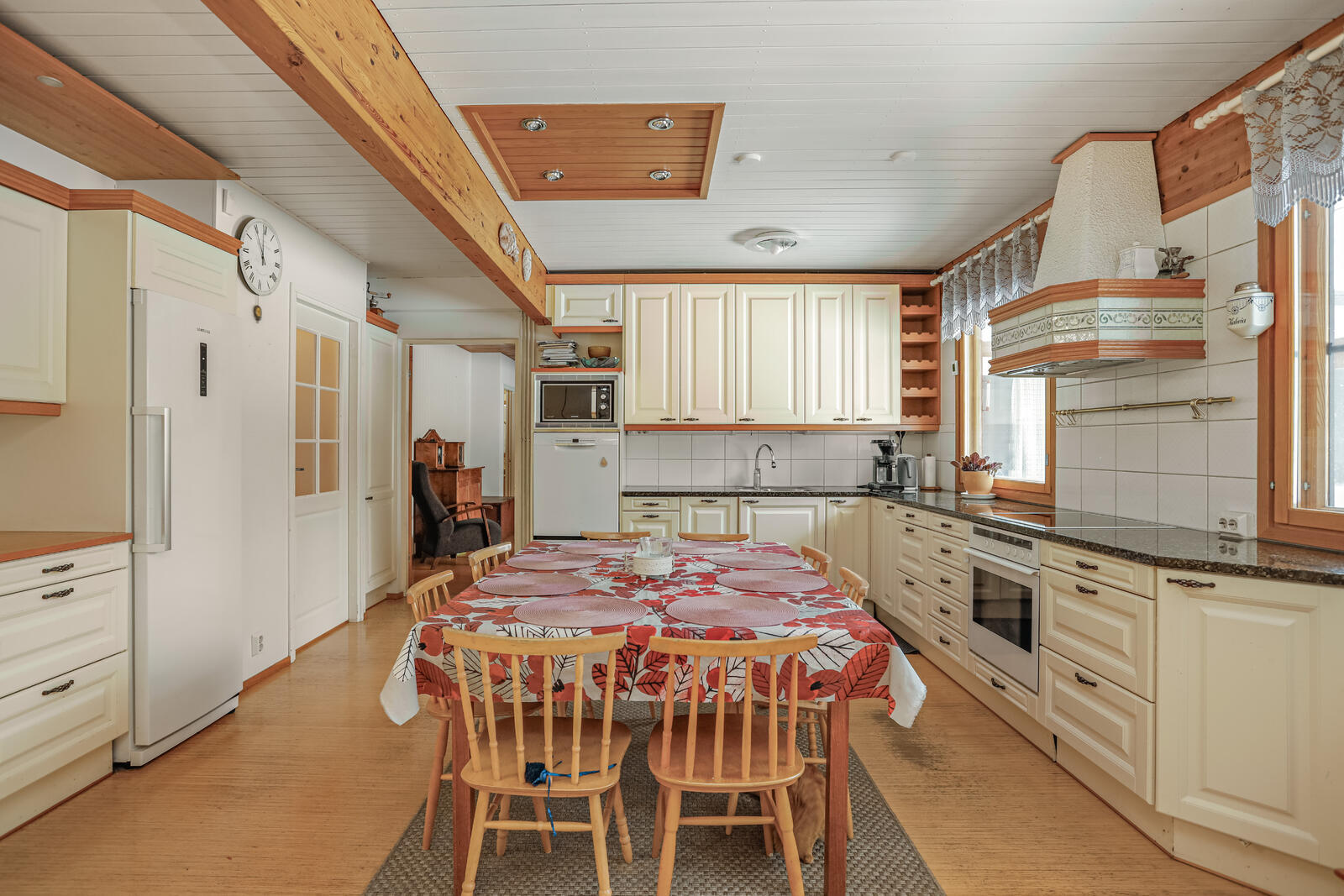 Liesi (Induktioliesi ja erillisuuni), työtasot (kivi), seinät (maali), lattiat (parketti), erillisuuni, liesi, jääkaappi, astianpesukone, erillinen pakastin ja liesituuletin / hormi |