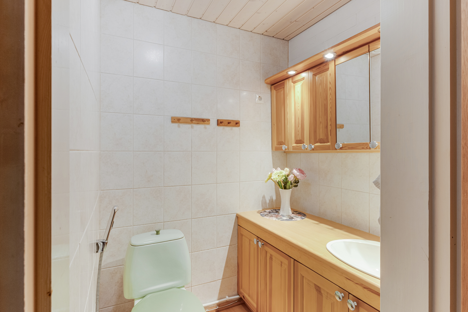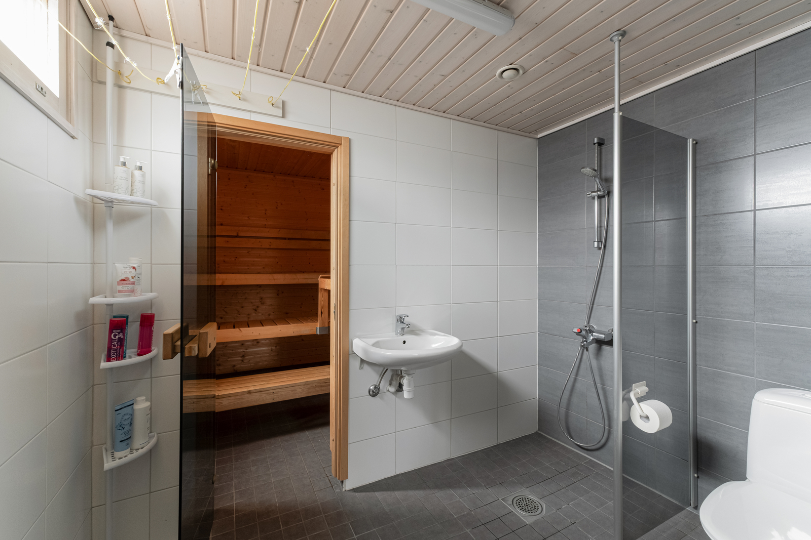 Suihkuseinä, wc-istuin, suihku, pesukoneliitäntä ja lattialämmitys, seinät (kaakeli), lattiat (laatta) |