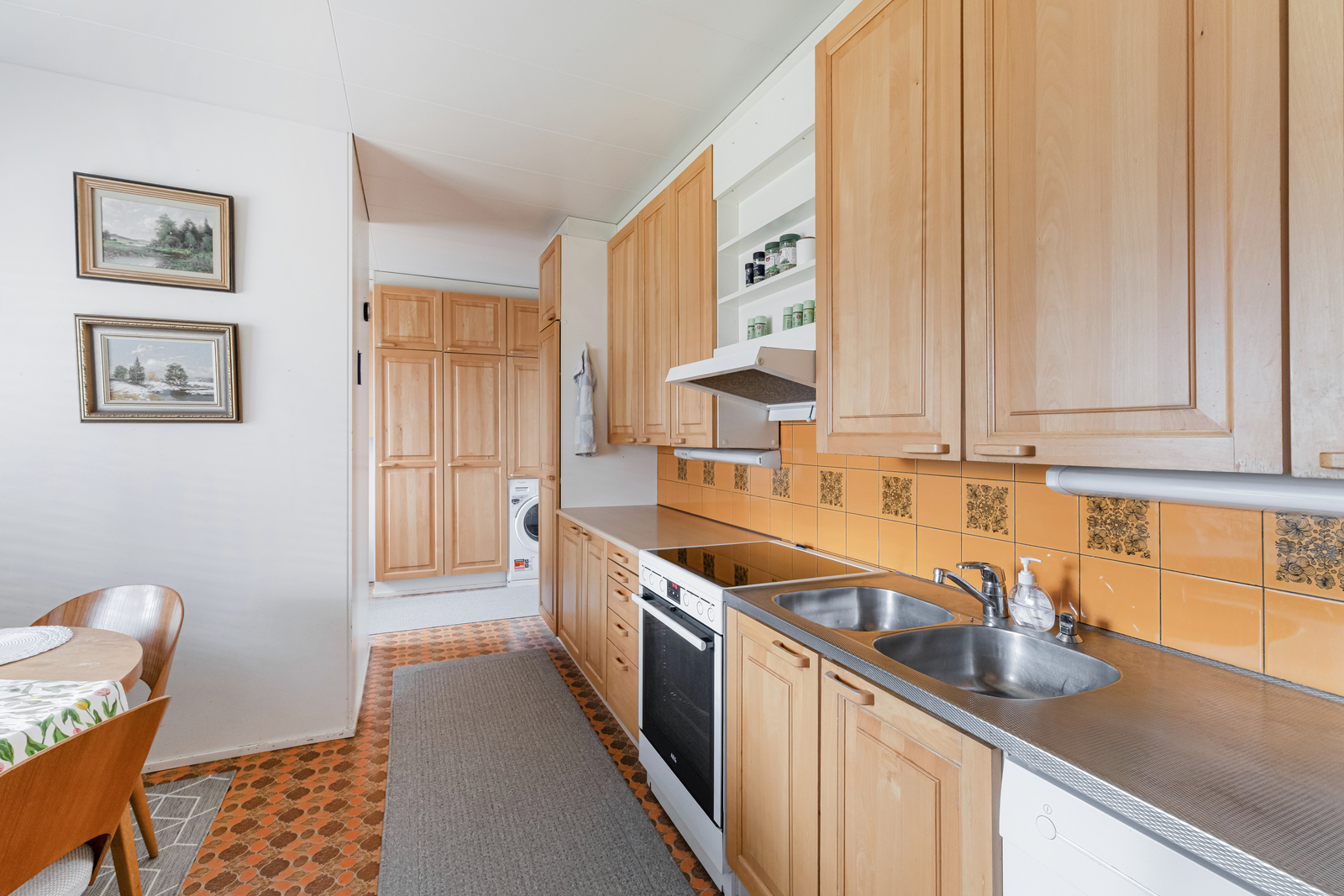 Liesi (Keraaminen liesi), työtasot (laminaatti ja metalli), seinät (maali), lattiat (muovimatto), jääkaappipakastin, astianpesukone ja kylmiö, liesituuletin / hormi |