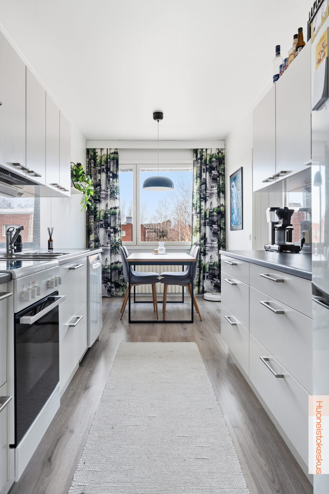| Keittiön kuvaus | Liesi (Keraaminen liesi), työtasot (laminaatti), seinät (maali ja välitilalevy), lattiat (laminaatti), liesituuletin (Aktiivihiilisuodattimella), uuni (Keraamisella liedellä), jääkaappipakastin ja astianpesukone |