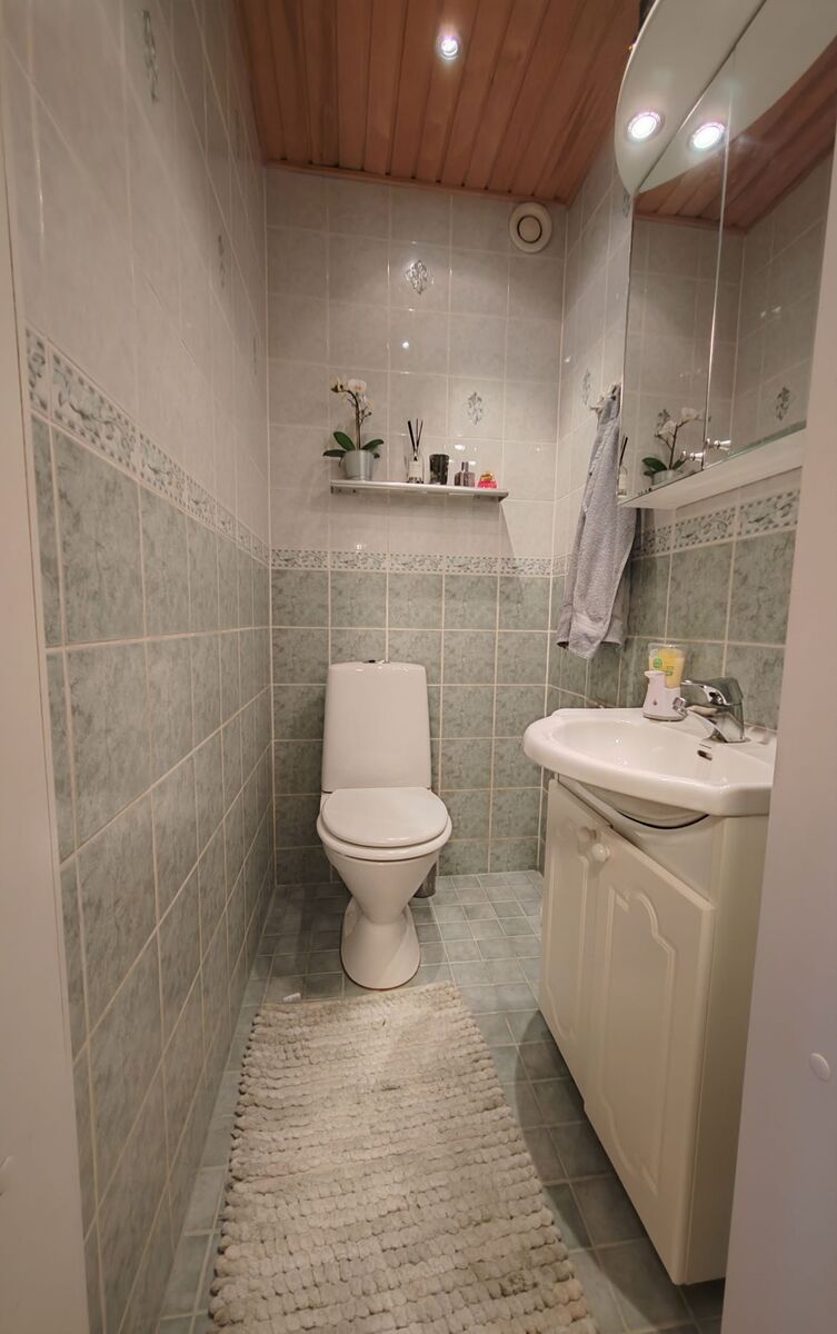 WC-istuin, kylpyamme, peili ja suihku, seinät (kaakeli), lattiat (muovimatto) |