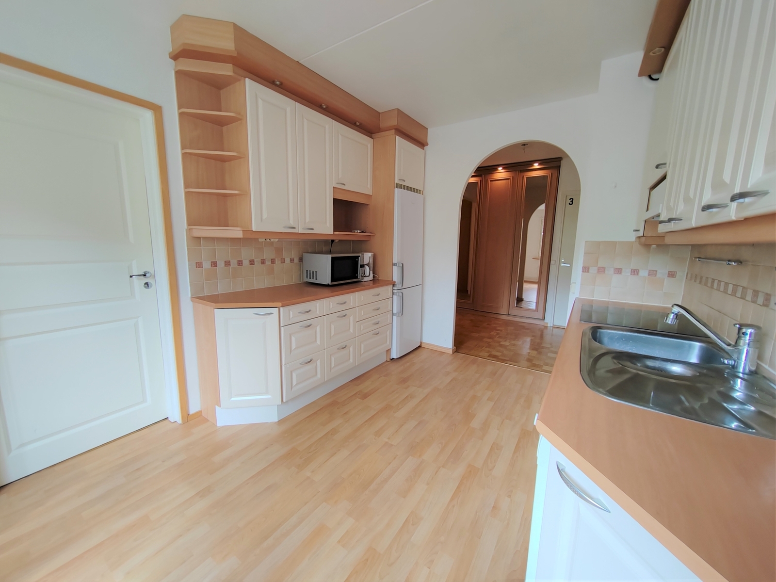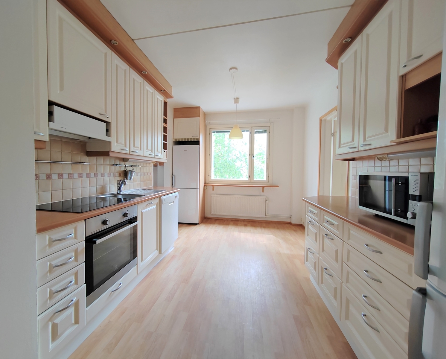 Liesi (Induktioliesi ja erillisuuni), työtasot (laminaatti), seinät (maali), lattiat (laminaatti), liesi, liesituuletin, erillisuuni, astianpesukone ja jääkaappipakastin |