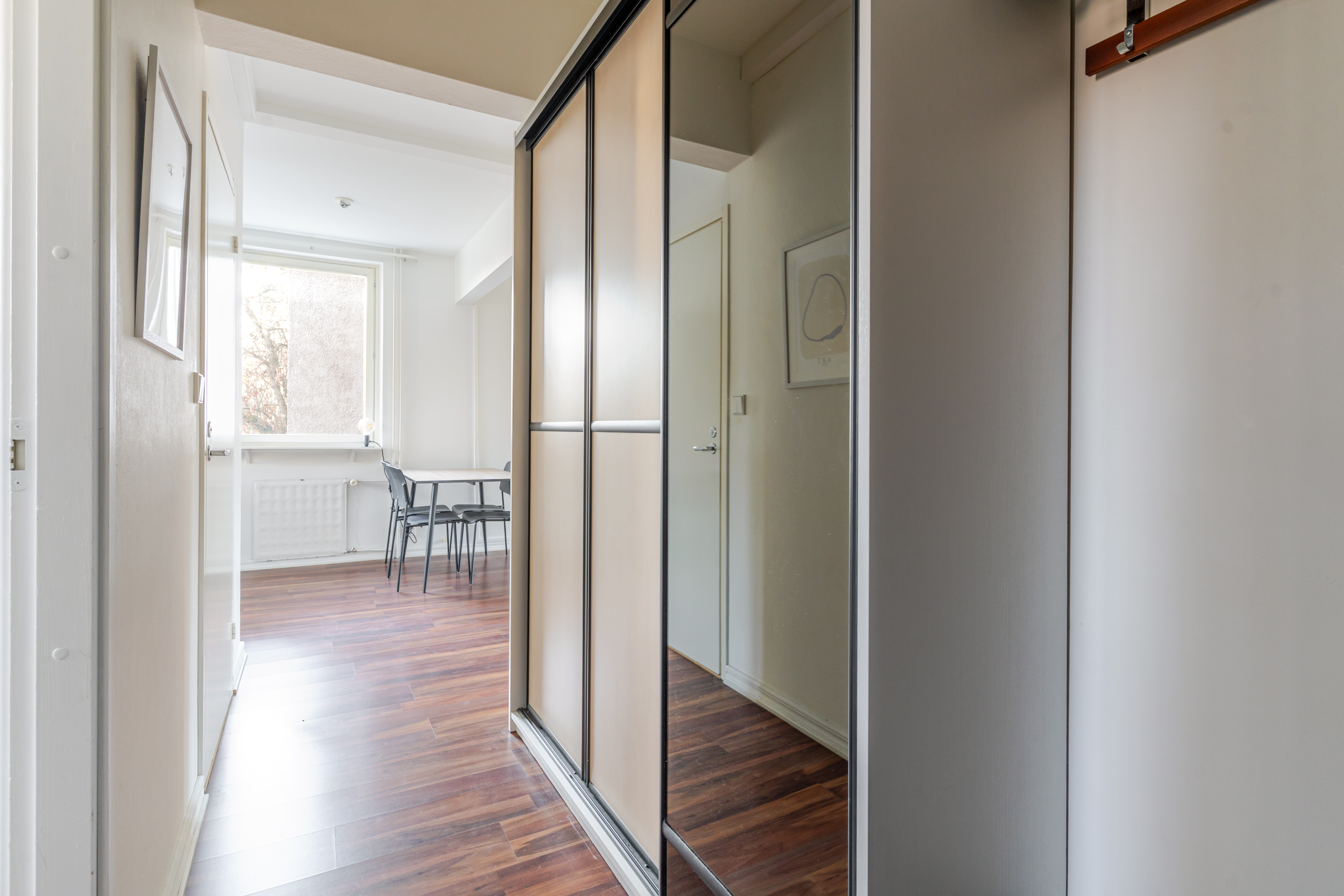Asunnossa on hyvin säilytystilaa: makuuhuoneessa ja eteisessä on kaapistot, ja lisäksi käytössä on vintti- ja kellarikomero.
