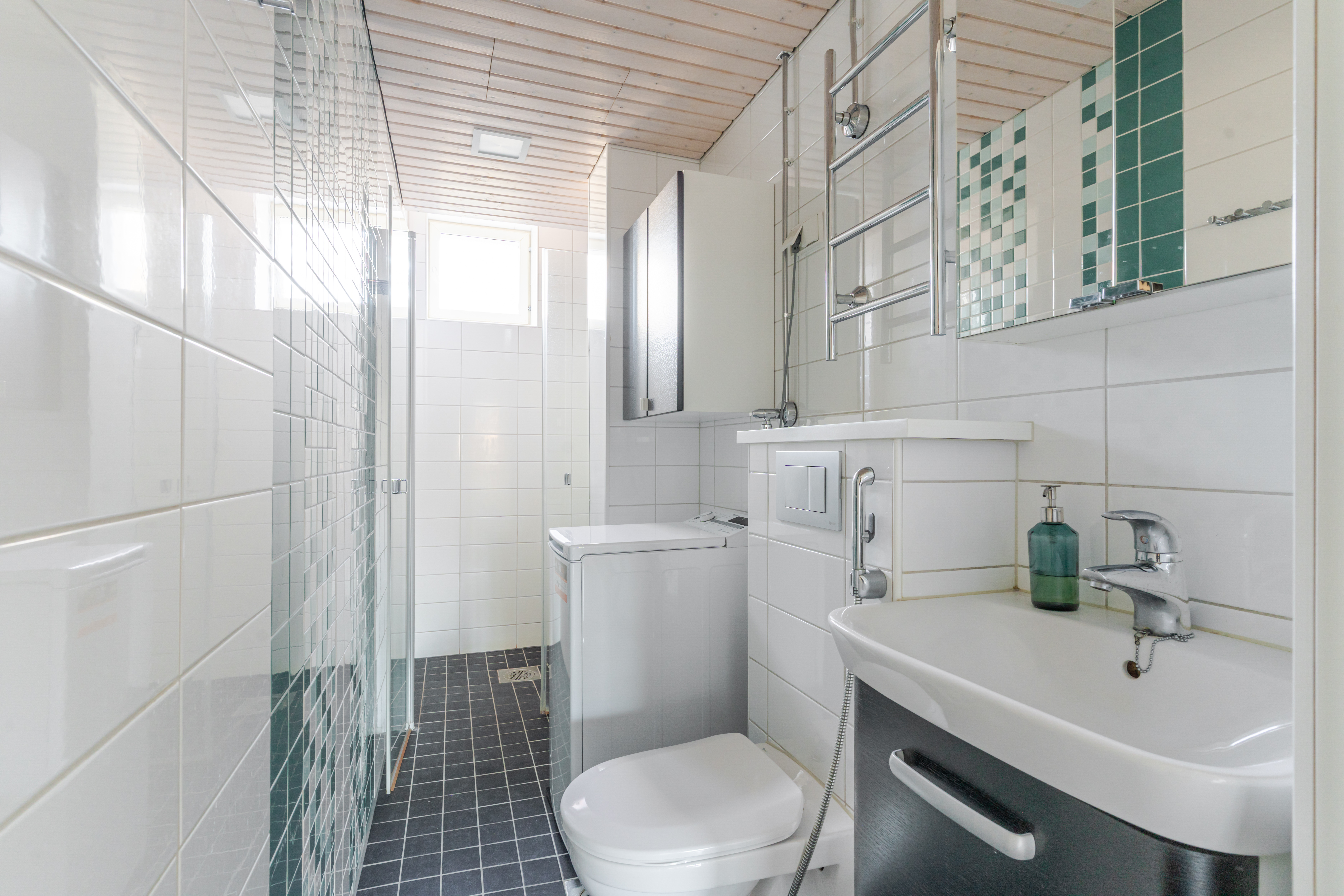 | Kylpyhuoneen kuvaus | WC-istuin, suihku, suihkuseinä, pesukoneliitäntä, allaskaappi, peili, bidee-suihku ja lattialämmitys, seinät (kaakeli), lattiat (laatta) |