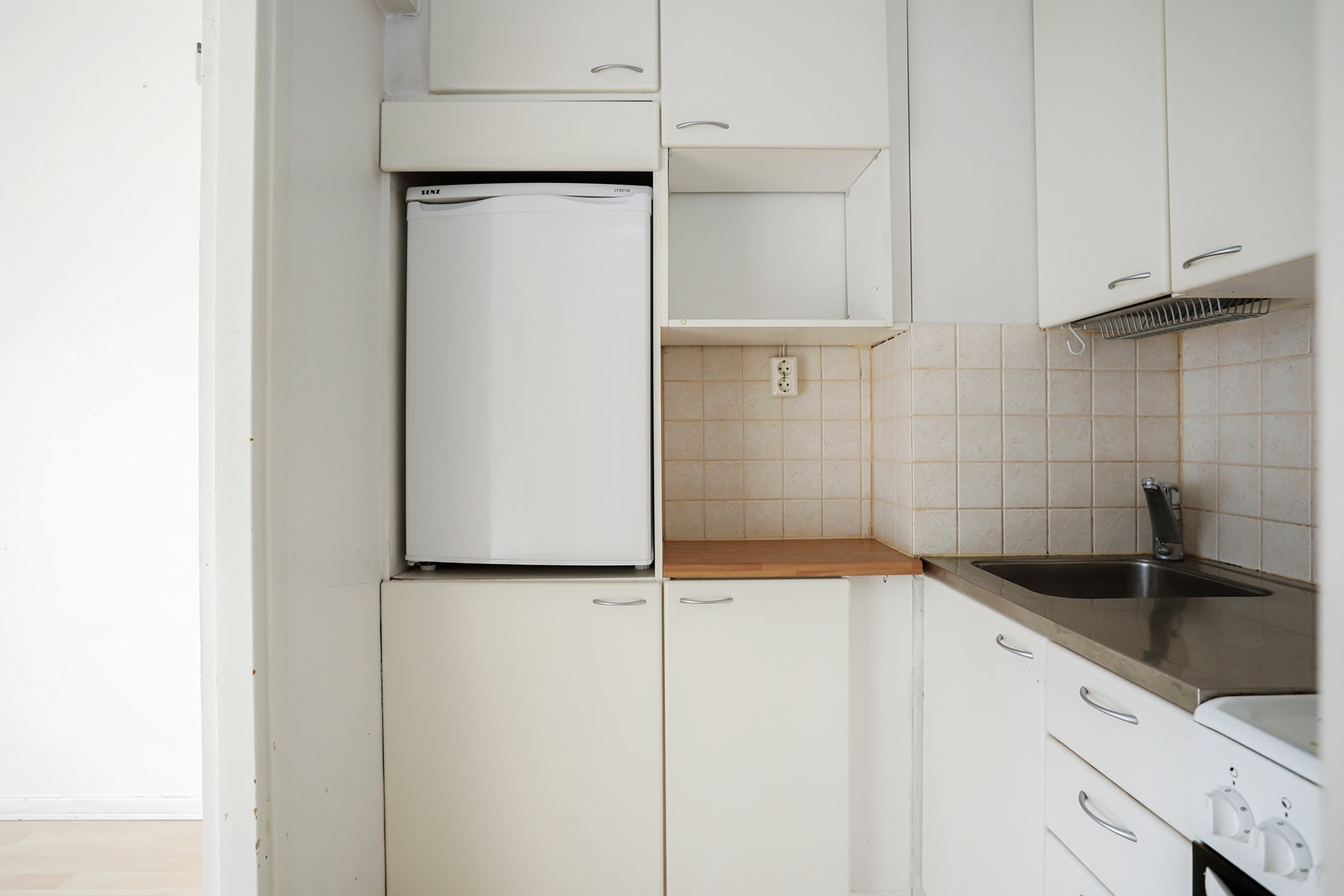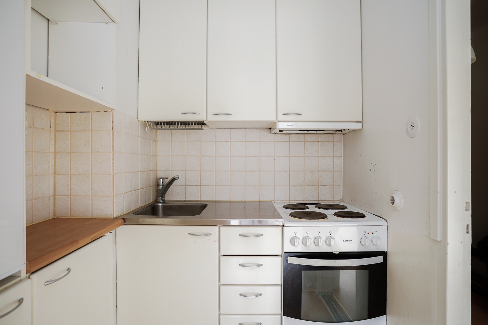 Liesi (sähköliesi), seinät (laatta ja maali), lattiat (laminaatti), jääkaappi, liesi, liesituuletin ja kiinteät valaisimet, Keittokomero kaipaa päivitystä. |