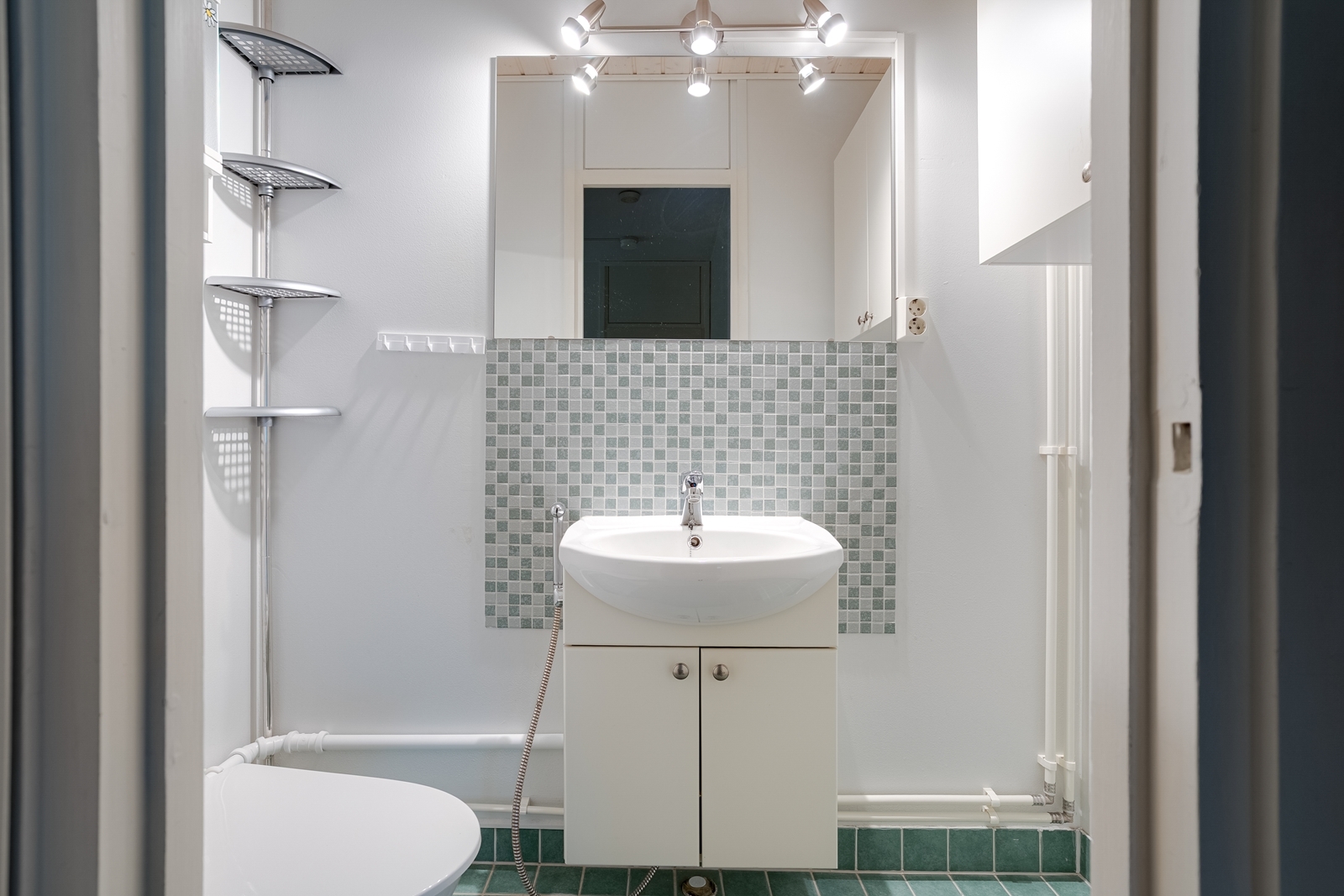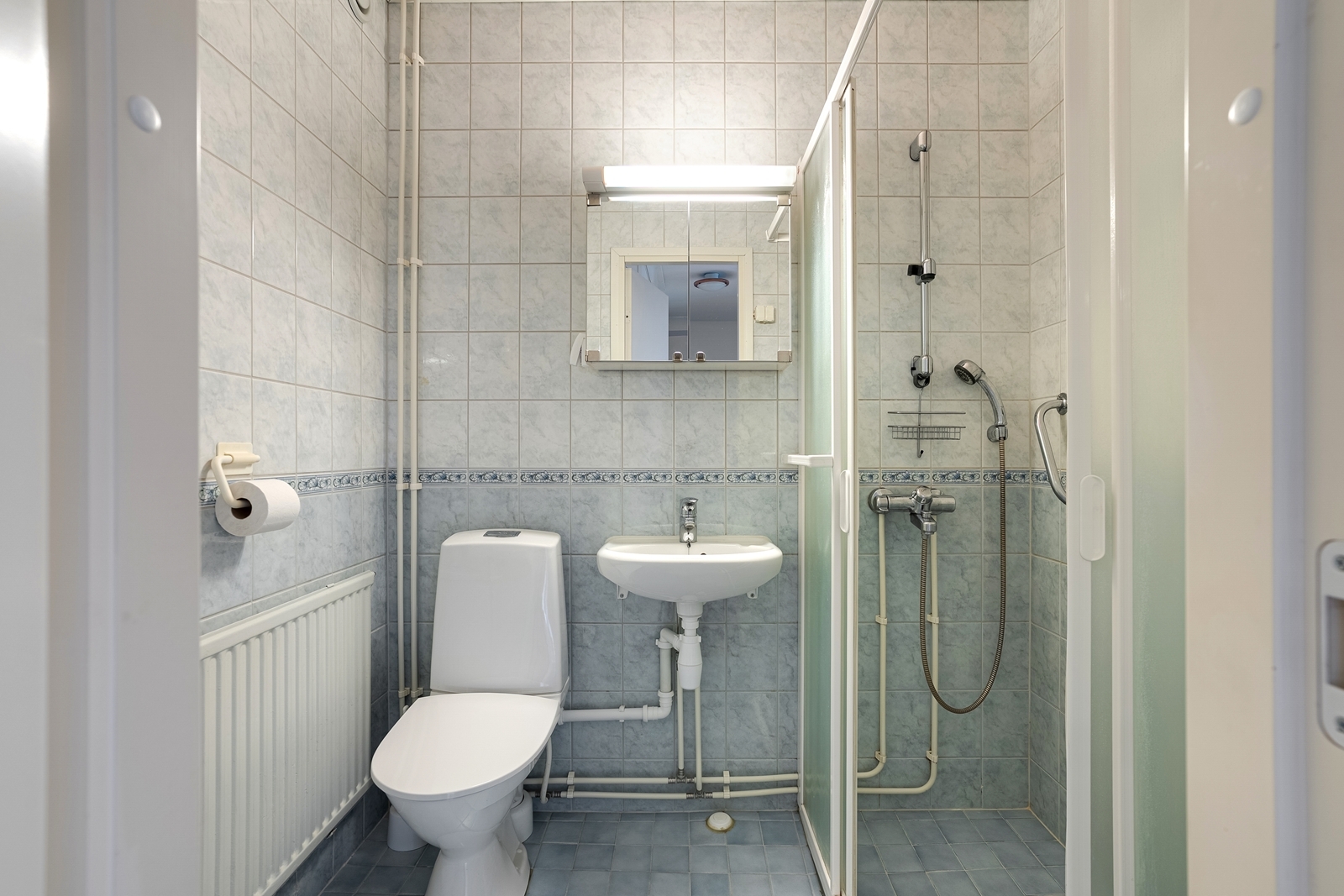 | Kylpyhuoneen kuvaus | Suihkuseinä, pesukoneliitäntä, wc-istuin, peilikaappi, suihku ja kiinteät valaisimet, seinät (kaakeli), lattiat (laatta) |
