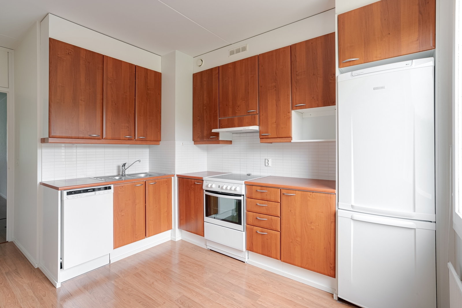 | Keittiön kuvaus | Liesi (Keraaminen liesi), työtasot (laminaatti), seinät (maali), lattiat (laminaatti), astianpesukone, jääkaappipakastin, liesituuletin ja kiinteät valaisimet |